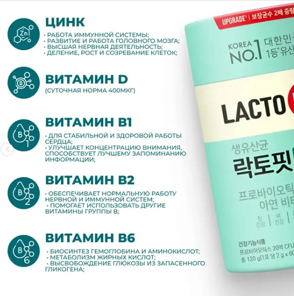 💳 Оплатить за товар можно при получении 🇰🇿 Есть бесплатная доставка по Казахстану 🎁 Копите бонусы с каждой покупки Lacto Fit Probiotics Kids 120 г — корейский синбиотик для детей от 3 лет: 7 штаммов пробиотиков, пребиотики (фруктоолигосахариды), витамины D₃, B₁-B₆, B₁₂, C, E, цинк. Улучшает пищеварение, иммунитет, помогает усвоению кальция. Выпускается в форме 60 саше по 2 г с йогуртово-виноградным вкусом. |