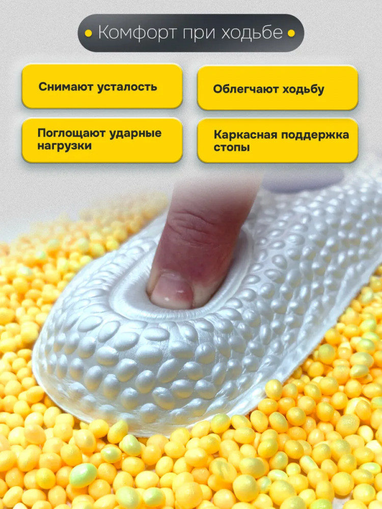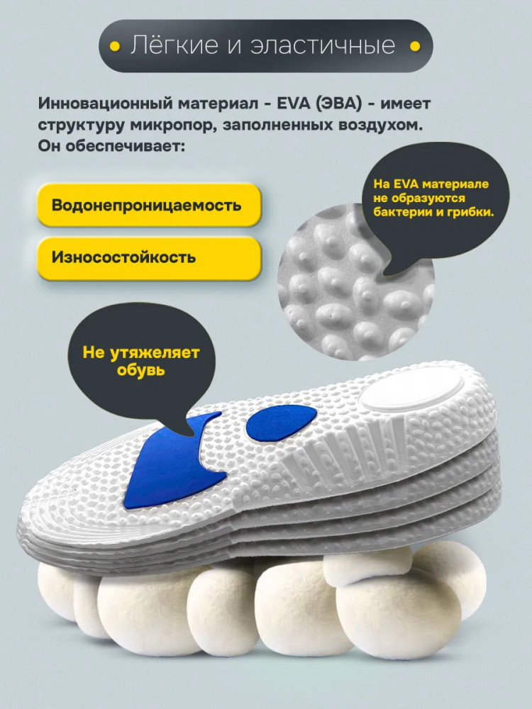 Стельки выполнены из инновационного материала EVA (ЭВА), который имеет уникальную структуру микропор, наполненных воздухом, обладает водонепроницаемостью и высокими теплоизоляционными свойствами. На EVA-материале не образуются бактерии и грибки. Оснащены влаговпитывающим покрытием, которое впитывает влагу, что способствует нормализации микроклимата у вас в обуви. Амортизатор поперечного свода стопы уменьшает нагрузку на передний отдел стопы, а пяточный амортизатор снижает и поглощает ударную нагрузку на пятку.