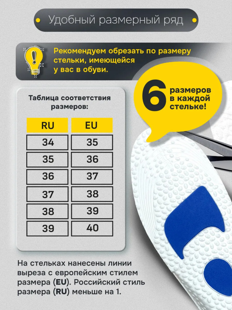 Стельки для обуви Shegra с амортизирующими вставками отлично подойдут для любой обуви, обеспечат комфорт при занятиях спортом и оптимальный микроклимат. Стельки для обуви с европейским размером EU 35-40, что соответствует российскому размеру RU 34-39. На стельках указан европейский стандарт размера EU, а также нанесены линии выреза. Для удобства на упаковке приведена таблица соответствия размеров RU/EU.