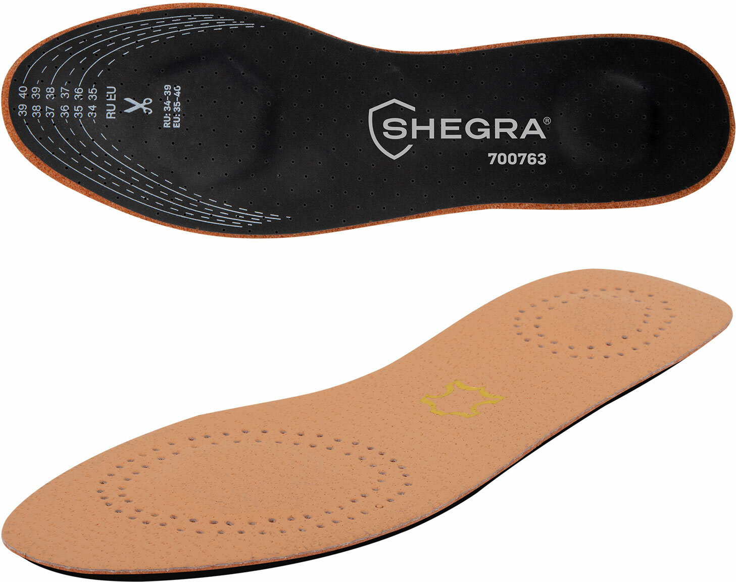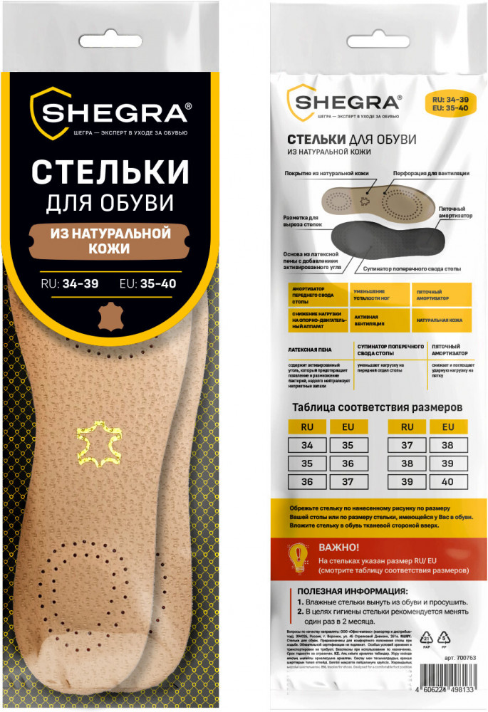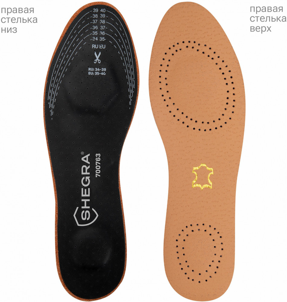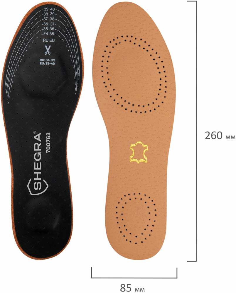Стельки для обуви Shegra из натуральной кожи с двумя амортизаторами отлично подойдут для любой обуви, обеспечат комфорт при ходьбе и оптимальный микроклимат. Стельки для обуви с российским размером RU 34-39, что соответствует европейскому размеру EU 35-40. На стельках указаны оба стандарта размера: RU и EU, а также нанесены линии выреза. Для удобства на упаковке приведена таблица соответствия размеров RU/EU.