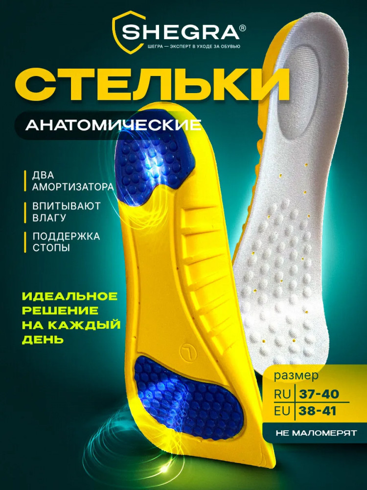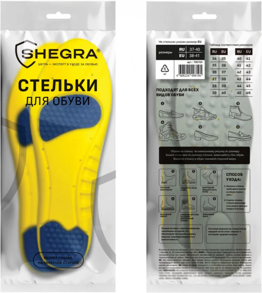 Стельки для обуви и кроссовок Shegra отлично подойдут для любой обуви, обеспечат комфорт при занятиях спортом и оптимальный микроклимат. Стельки для обуви с европейским размером EU 38-41, что соответствует российскому размеру RU 37-40. На стельках указан европейский стандарт размера EU, а также нанесены линии выреза. Для удобства на упаковке приведена таблица соответствия размеров RU/EU.