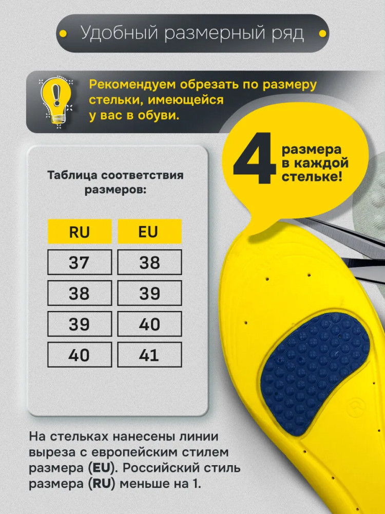 Обрежьте стельку по нанесенному размеру Вашей стопы или по размерам стельки, имеющейся у Вас в обуви. Вложите стельку тканевой стороной вверх. В целях гигиены рекомендуется менять стельки раз в два месяца.