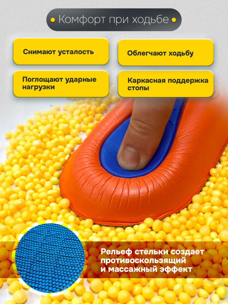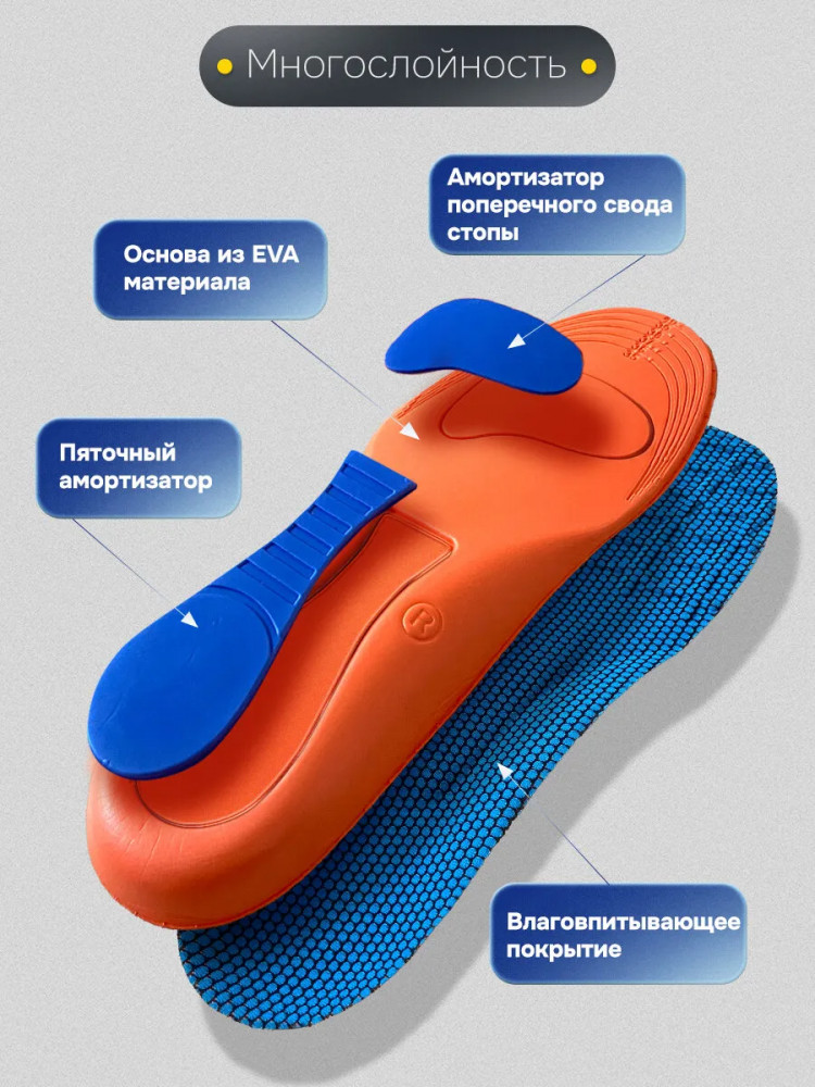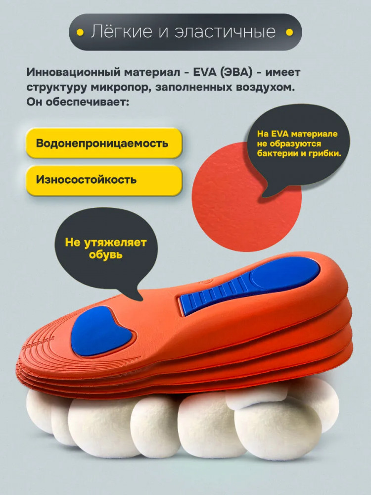 Стельки выполнены из инновационного материала EVA (ЭВА), который имеет уникальную структуру микропор, наполненных воздухом, обладает водонепроницаемостью и высокими теплоизоляционными свойствами. На EVA-материале не образуются бактерии и грибки. Оснащены влаговпитывающим покрытием, которое способствует нормализации микроклимата у вас в обуви. Амортизатор поперечного свода стопы уменьшает нагрузку на передний отдел стопы, а супинатор продольного свода способствует равномерному распределению нагрузки на стопу. Стельки также оснащены пяточным амортизатором, который снижает и поглощает ударную нагрузку на пятку.