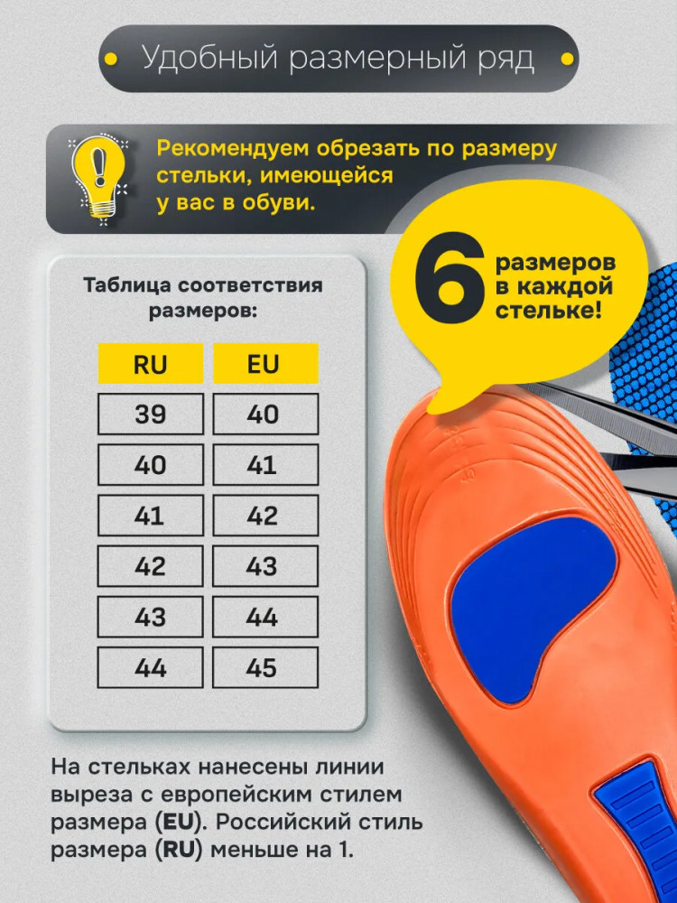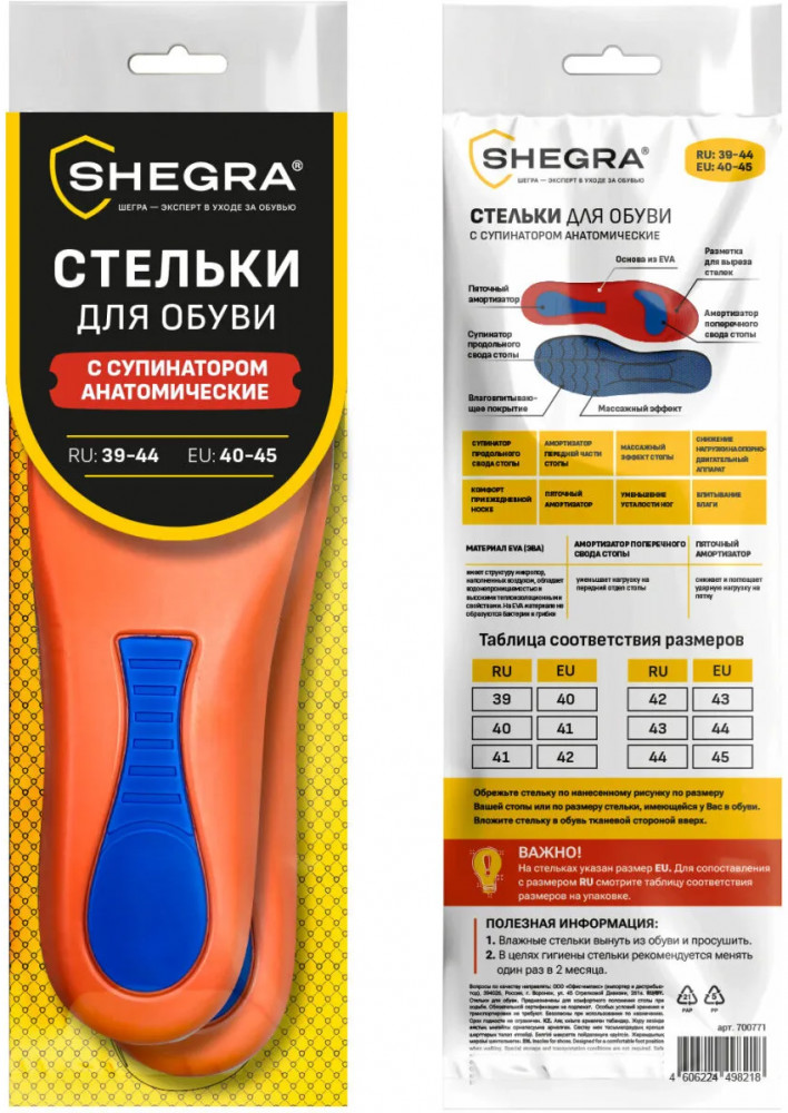 Стельки для обуви Shegra анатомические с супинатором отлично подойдут для любой обуви, обеспечат комфорт при ходьбе и оптимальный микроклимат. Стельки для обуви с европейским размером EU 40-45, что соответствует российскому размеру RU 39-44. На стельках указан европейский стандарт размера EU, а также нанесены линии выреза. Для удобства на упаковке приведена таблица соответствия размеров RU/EU.