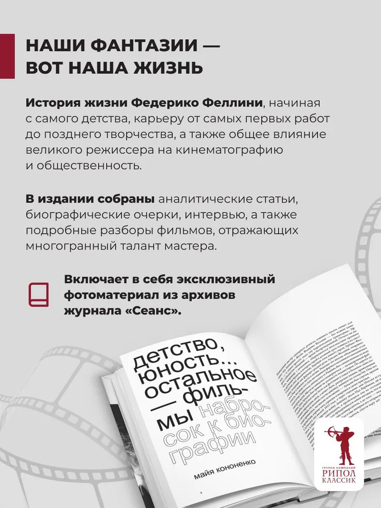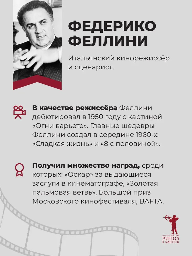 💳 Оплатить за товар можно при получении 🇰🇿 Есть бесплатная доставка по Казахстану от 1 дня 🎁 Копите бонусы с каждой покупки Серия: Сеанс&Рипол Федерико Феллини (1920–1993) — легендарный режиссер, икона итальянского и мирового кинематографа, творец эпохи больших авторов. Он снимал разное кино: для одних был социальным реалистом, для других — фантазером и фокусником, а кому-то казался сатириком и мастером гротеска. Бессмысленно перечислять его призы и награды: не «Оскары», не «Золотые львы» и не «Золотые пальмовые ветви» подпитывают авторитет одного из главных чудотворцев в истории кино, а любовь к его фильмам и их героям. Образы Феллини — детский рисунок, лишенный полутонов и подтекстов. |