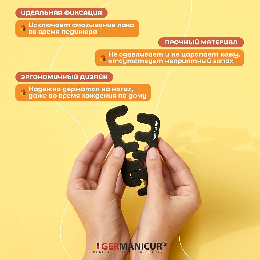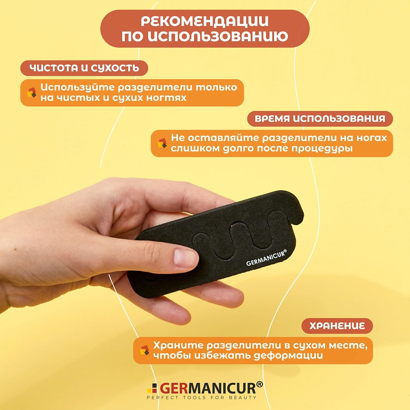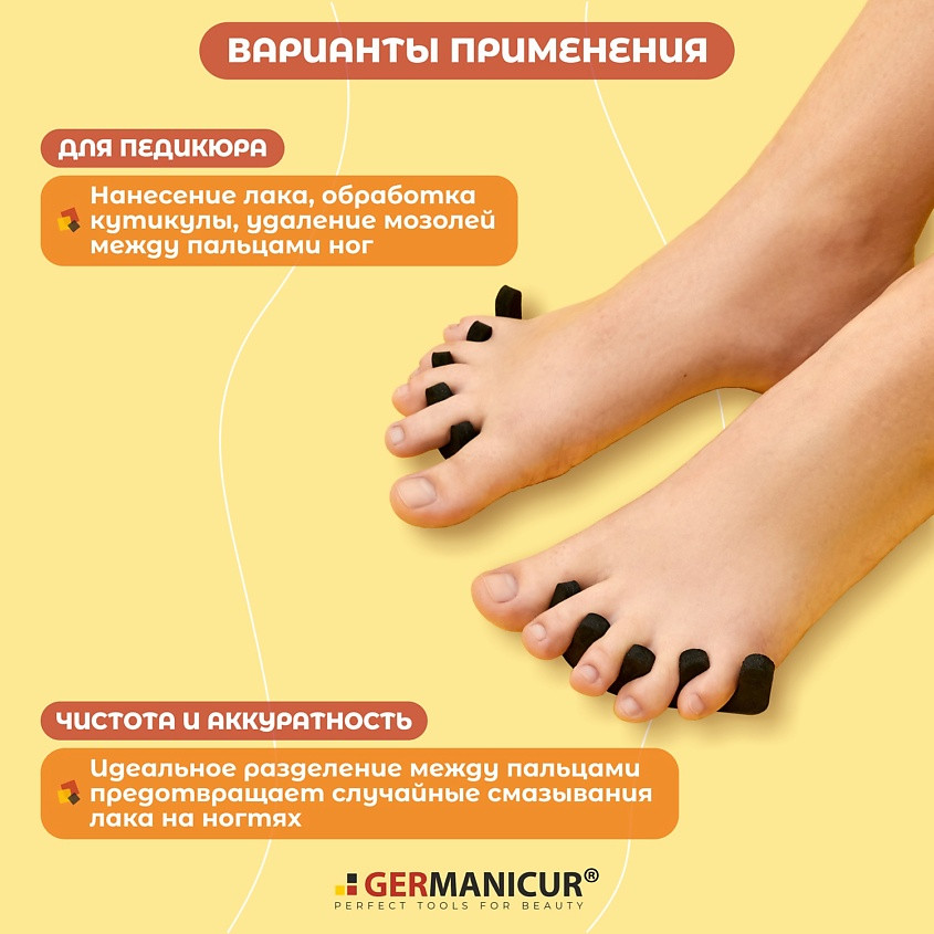 Germanicur Разделители для пальцев ногВ данный момент этот товар отсутствует в продаже. Возможно, у нас найдется аналогичный или похожий товар здесь. Мягкие и удобные пенопропиленовые разделители для пальцев ног помогут Вам при проведении процедуры педикюра. Используя разделитель пальцев вы можете свободно обработать каждый ноготок, затем нанести покрытие: гель-лаковое или лаковое, не беспокоясь, что покрытие смажется или оставит след на соседнем пальчике! С разделителями пальцев Вам обеспечен безупречный педикюр в домашних условиях как в салоне красоты. |