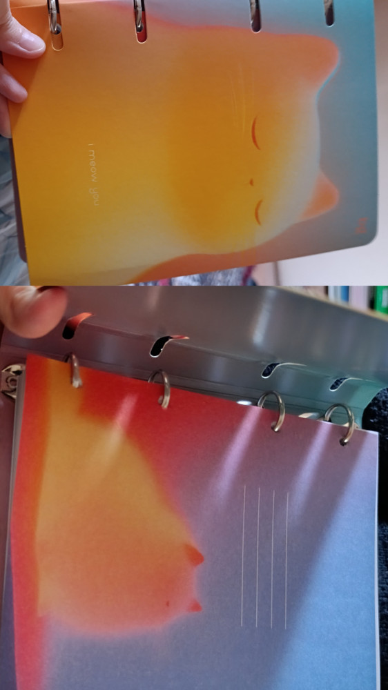 материал очень отличается от того что я себе представляла, обложка это спрессованный картон с принтом (думаю он не промокает так легко) ещё внутренняя страница это бумага которая ощущается чуть толще. и внутри бумага тоже хорошая, не полупрозрачная, расписала всю первую страницу с обоих сторон черной гелевой ручкой, все отлично. И все же думаю износится может быстрее из-за конструкции, так что желательно пользоваться не так халатно. Ещё удобно что могу добавлять какие только страницы хочу, был бы дырокол, и подогнать страницы по размеру)))