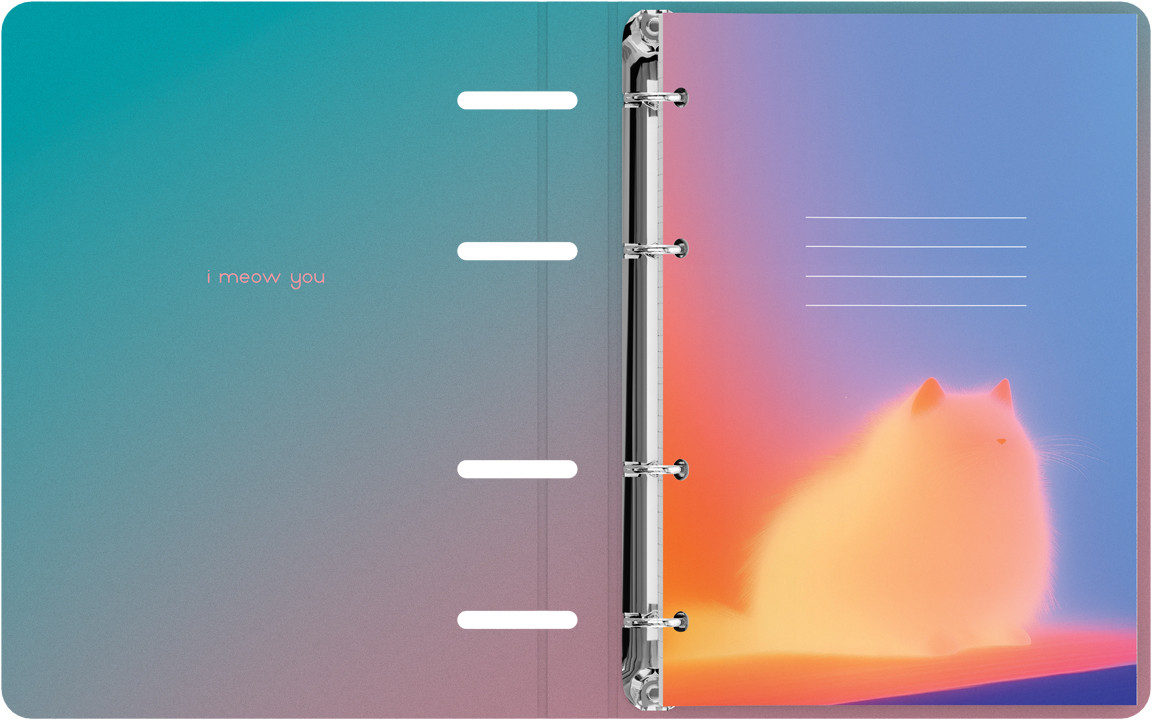 Тетрадь на кольцах BG «Meow» формата А5 подходит для большого объёма записей. Эффектный дизайн обложки и форзаца поднимет настроение на учёбе или работе. Размер — 160×212 мм. Внутренний блок состоит из 120 белых листов с линовкой в клетку. Плотность офсетной бумаги — 60-65 г/м2. Белизна — 100%. Механизм из 4 колец обеспечивает быструю смену или добавление листов при необходимости. Обложка сделана из плотного картона, который надёжно защищает внутренний блок. Отделка обложки — soft-touch ламинация. Тетрадь упакована в картон и индивидуальный пакет. |