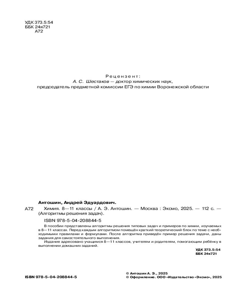 💳 Оплатить за товар можно при получении 🇰🇿 Есть бесплатная доставка по Казахстану от 1 дня 🎁 Копите бонусы с каждой покупки Серия: Алгоритмы решения задач (обложка) Надоело искать в учебниках нужную информацию в море формул и законов? Вас спасет книга, в которой изложены алгоритмы решения типовых задач по химии, изучаемых в 8, 9, 10 и 11 классах. Перед алгоритмом приводится только важная теория по теме с необходимыми правилами и формулами. Сам алгоритм поделен на четкие шаги, следуя которым можно справиться с любой задачей по химии. После алгоритма расположены пример решения типовой задачи, а также задания для самостоятельного выполнения. Такой подход к занятиям поможет быстро выработать навык уверенного решения любых типов задач на уроках и контрольных. Родители с помощью этого школьного справочника смогут оказать поддержку детям и вместе разобраться в домашних заданиях. Также пособие будет полезно учителям и репетиторам при организации занятий и подготовки к ЕГЭ 2026. |