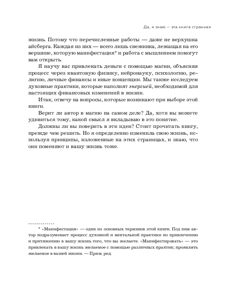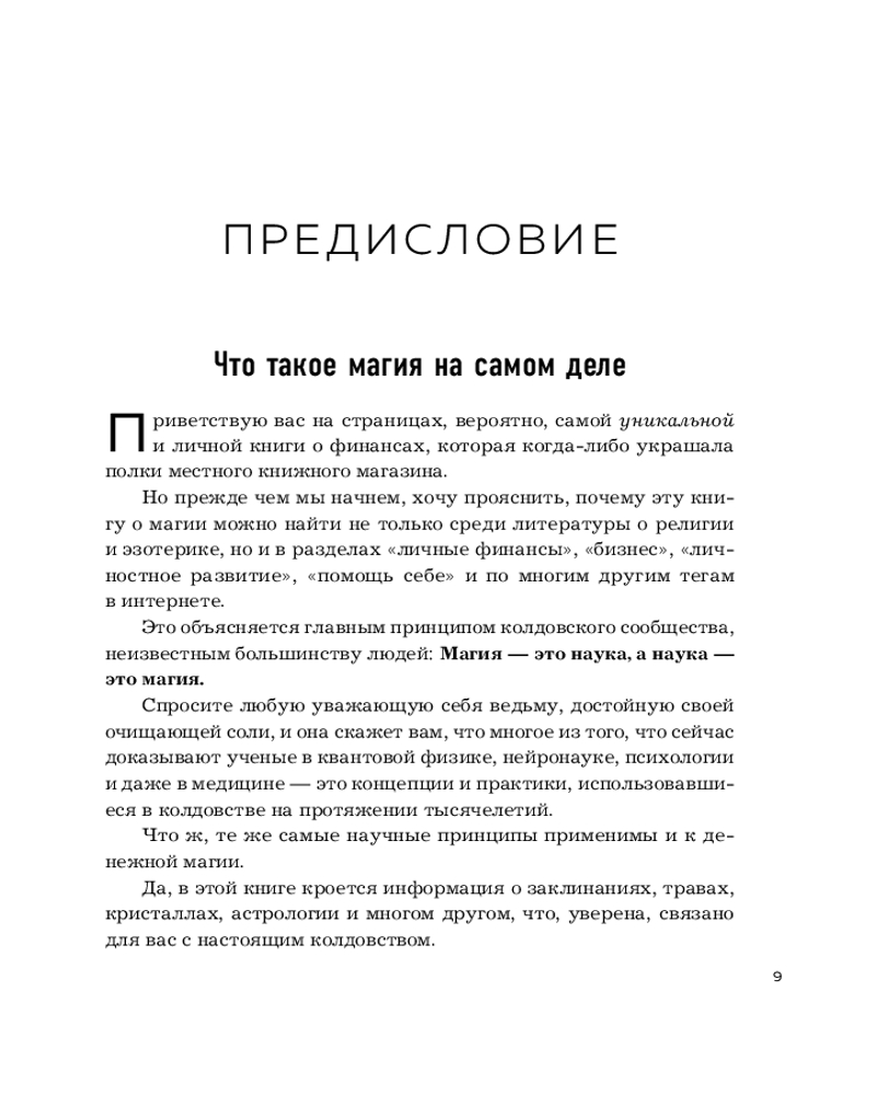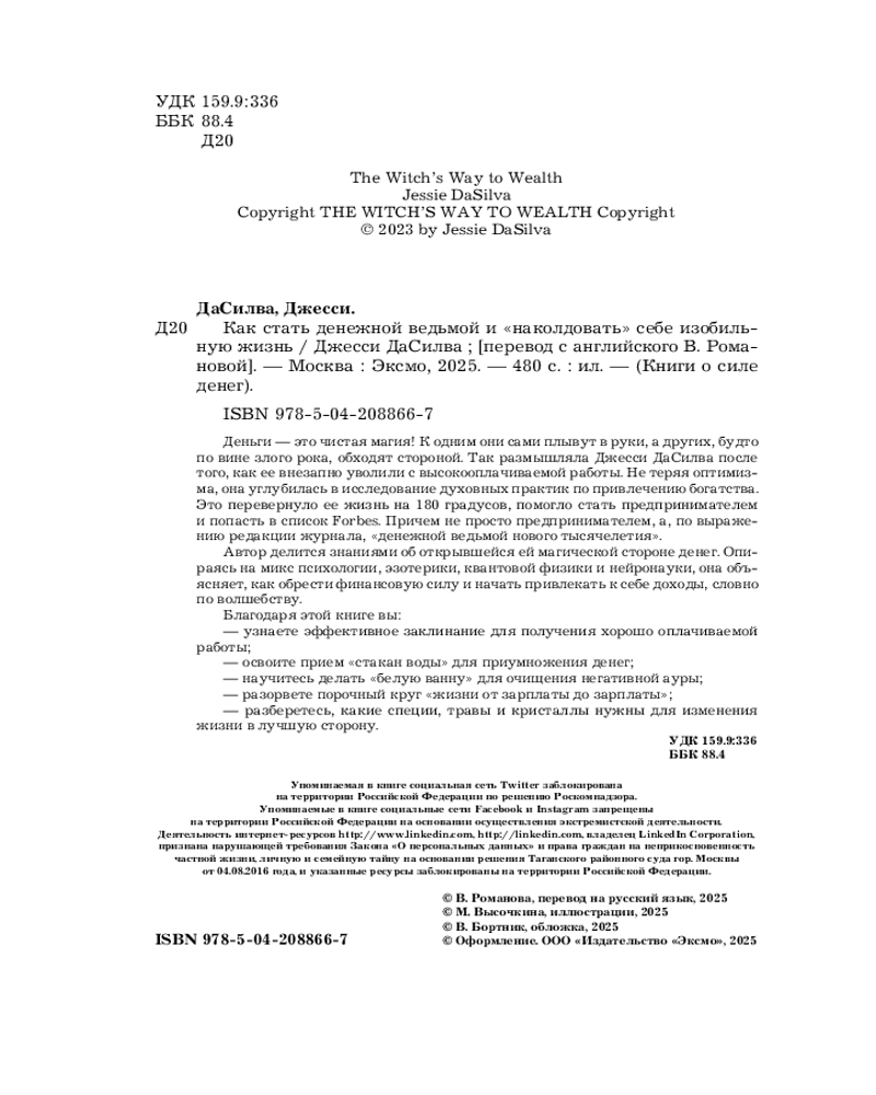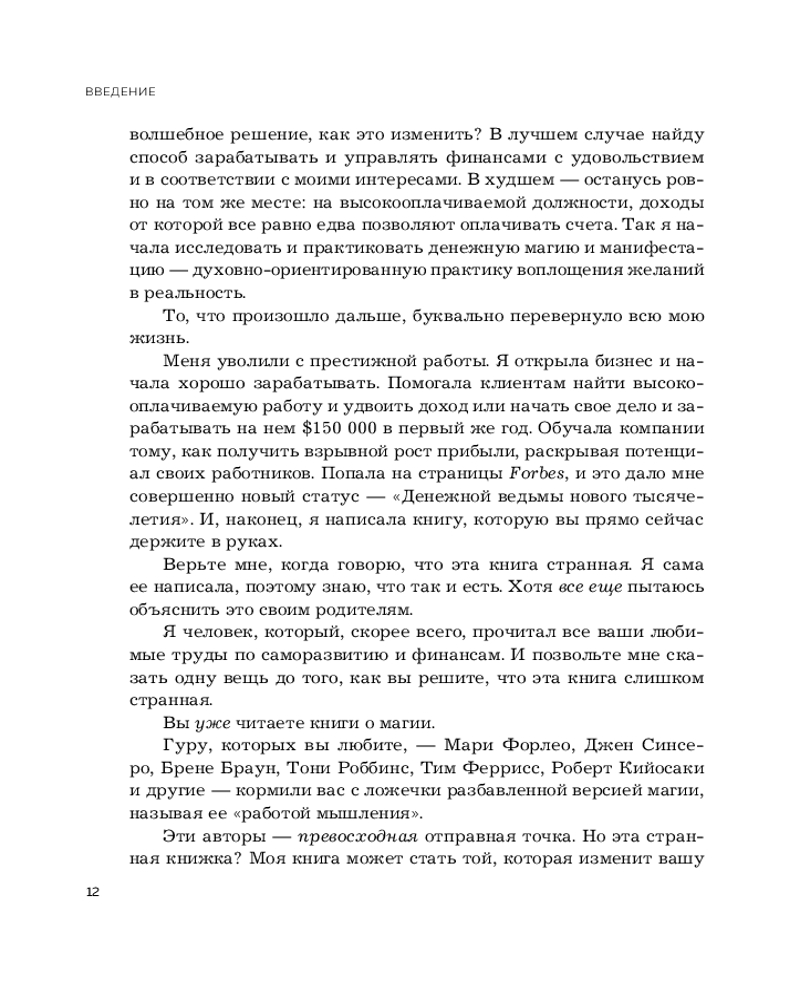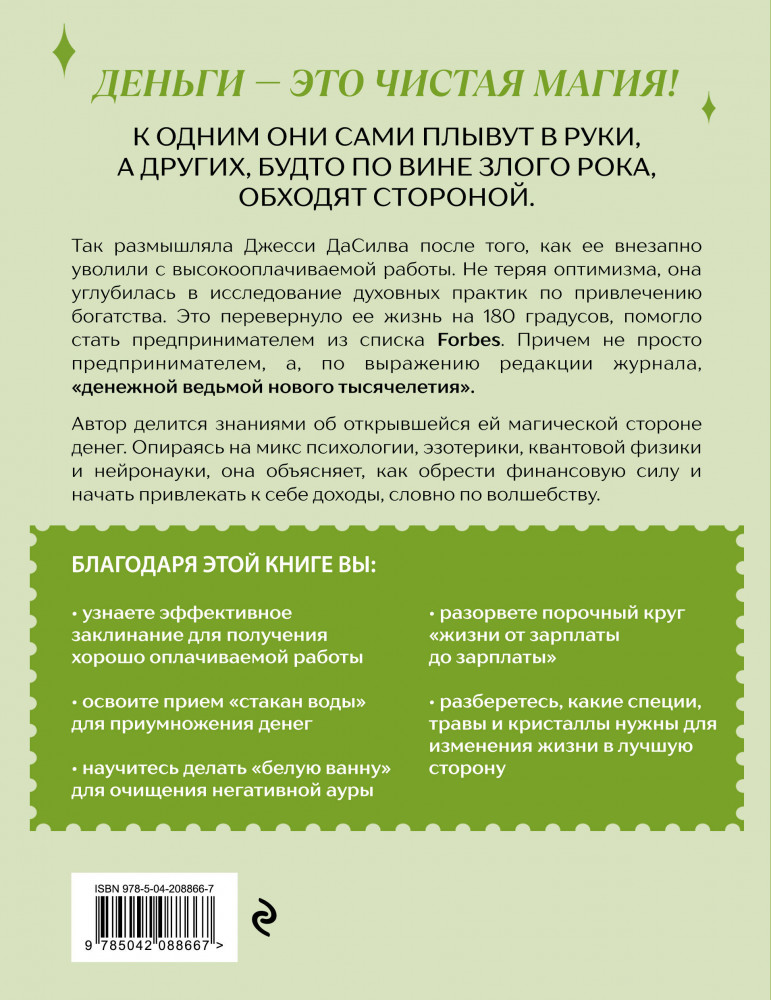 Серия: Книги о силе денег Деньги — это чистая магия! К одним они сами плывут в руки, а других, будто по вине злого рока, обходят стороной. Так размышляла Джесси ДаСилва после того, как ее внезапно уволили с высокооплачиваемой работы. Не теряя оптимизма, она углубилась в исследование духовных практик по привлечению богатства. Это перевернуло ее жизнь на 180 градусов, помогло стать предпринимателем и попасть в список Forbes. Причем не просто предпринимателем, а, по выражению редакции журнала, «денежной ведьмой нового тысячелетия». Автор делится знаниями об открывшейся ей магической стороне денег. Опираясь на микс психологии, эзотерики, квантовой физики и нейронауки, она объясняет, как обрести финансовую силу и начать привлекать к себе доходы, словно по волшебству. |