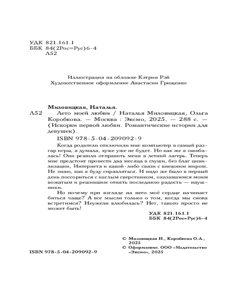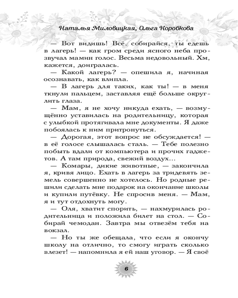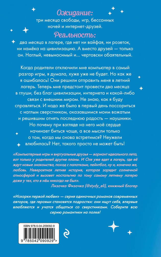 💳 Оплатить за товар можно при получении 🇰🇿 Есть бесплатная доставка по Казахстану от 1 дня 🎁 Копите бонусы с каждой покупки Серия: Искорки первой любви. Романтические истории для девушек Когда родители отключили мне компьютер в самый разгар игры, я думала, хуже уже не будет. Но как же я ошибалась! Они решили отправить меня в летний лагерь. Теперь мне предстоит провести два месяца в глуши, без благ цивилизации, Интернета и какой-либо связи с внешним миром. Не знаю, как я буду справляться. И надо же было в первый день поссориться с наглым сверстником, оказавшимся моим вожатым и решившим отнять последнюю радость — наушники. Но почему при взгляде на него мое сердце начинает биться чаще? А все мысли только о том, когда мы снова встретимся? Неужели влюбилась? Нет, такого просто не может быть! |