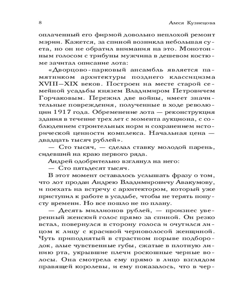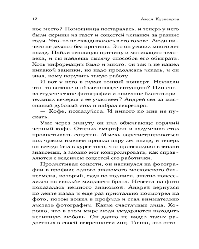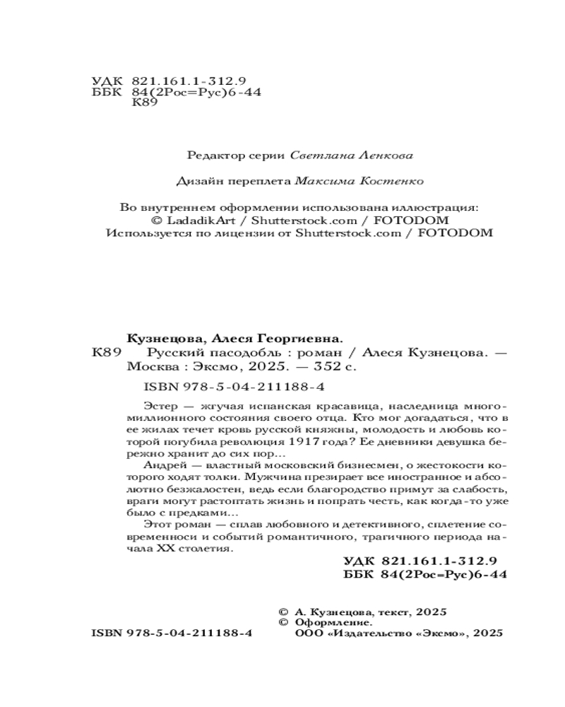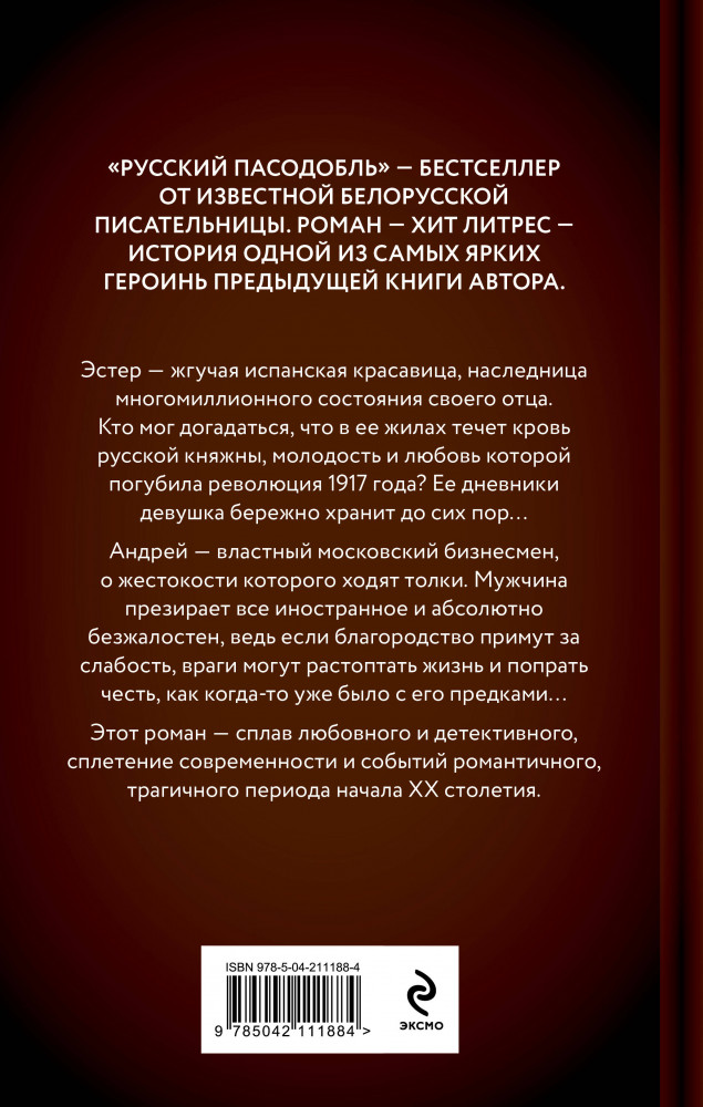 💳 Оплатить за товар можно при получении 🇰🇿 Есть бесплатная доставка по Казахстану от 1 дня 🎁 Копите бонусы с каждой покупки Серия: Встреча, изменившая жизнь. Любовные романы Алеси Кузнецовой Эстер — жгучая испанская красавица, наследница многомиллионного состояния своего отца. Кто мог догадаться, что в ее жилах течет кровь русской княжны, молодость и любовь которой погубила революция 1917 года? Ее дневники девушка бережно хранит до сих пор... Андрей — властный московский бизнесмен, о жестокости которого ходят толки. Мужчина презирает все иностранное и абсолютно безжалостен, ведь если благородство примут за слабость, враги могут растоптать жизнь и попрать честь, как когда-то уже было с предками... Этот роман — сплав любовного и детективного, сплетение современности и событий романтичного, трагичного периода начала XX столетия. |