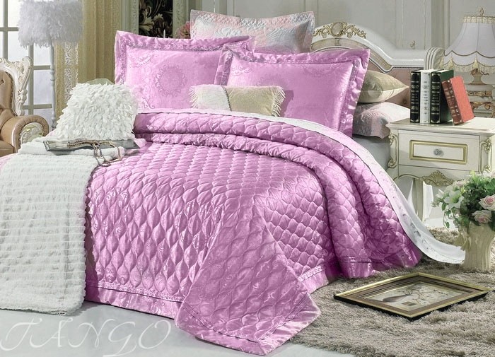Жаккардовые покрывала «Tango» - это двухстороннее стеганое полотно из жаккарда и хлопка, между которыми находится тонкий слой синтепона. Плотность наполнителя 100г/м2. Жаккардовые покрывала окантованы по краям косой бейкой.