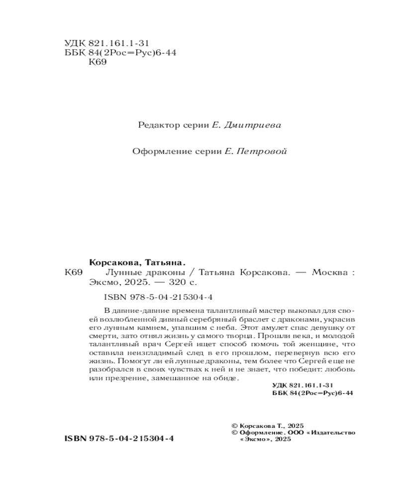 💳 Оплатить за товар можно при получении 🇰🇿 Есть бесплатная доставка по Казахстану от 1 дня 🎁 Копите бонусы с каждой покупки Серия: Татьяна Корсакова. Королева мистического романа. Новое оформление В давние-давние времена талантливый мастер выковал для своей возлюбленной дивный серебряный браслет с драконами, украсив его лунным камнем, упавшим с неба. Этот амулет спас девушку от смерти, зато отнял жизнь у самого творца. Прошли века, и молодой талантливый врач Сергей ищет способ помочь той женщине, что оставила неизгладимый след в его прошлом, перевернув всю его жизнь. Помогут ли ей лунные драконы, тем более что Сергей еще не разобрался в своих чувствах к ней и не знает, что победит: любовь или презрение, замешанное на обиде. |