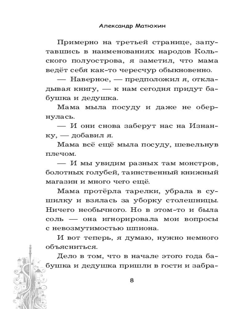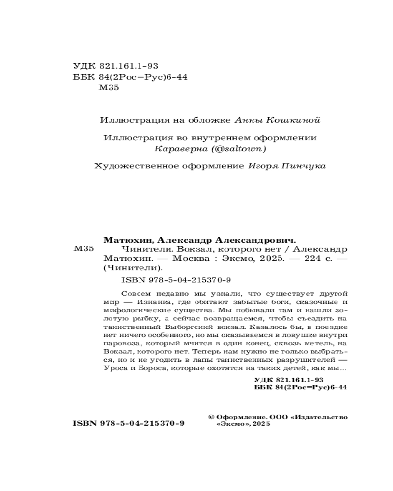💳 Оплатить за товар можно при получении 🇰🇿 Есть бесплатная доставка по Казахстану от 1 дня 🎁 Копите бонусы с каждой покупки Серия: Чинители Совсем недавно мы узнали, что существует другой мир — Изнанка, где обитают забытые боги, сказочные и мифологические существа. Мы побывали там и нашли золотую рыбку, а сейчас возвращаемся, чтобы съездить на таинственный Выборгский вокзал. Казалось бы, в поездке нет ничего особенного, но мы оказываемся в ловушке внутри паровоза, который мчится в один конец, сквозь метель, на Вокзал, которого нет. Теперь нам нужно не только выбраться, но и не угодить в лапы таинственных разрушителей — Уроса и Бороса, которые охотятся на таких детей, как мы... |