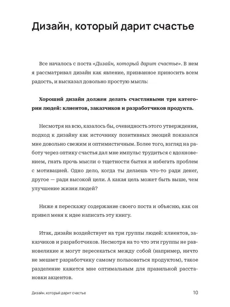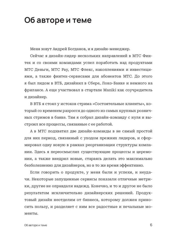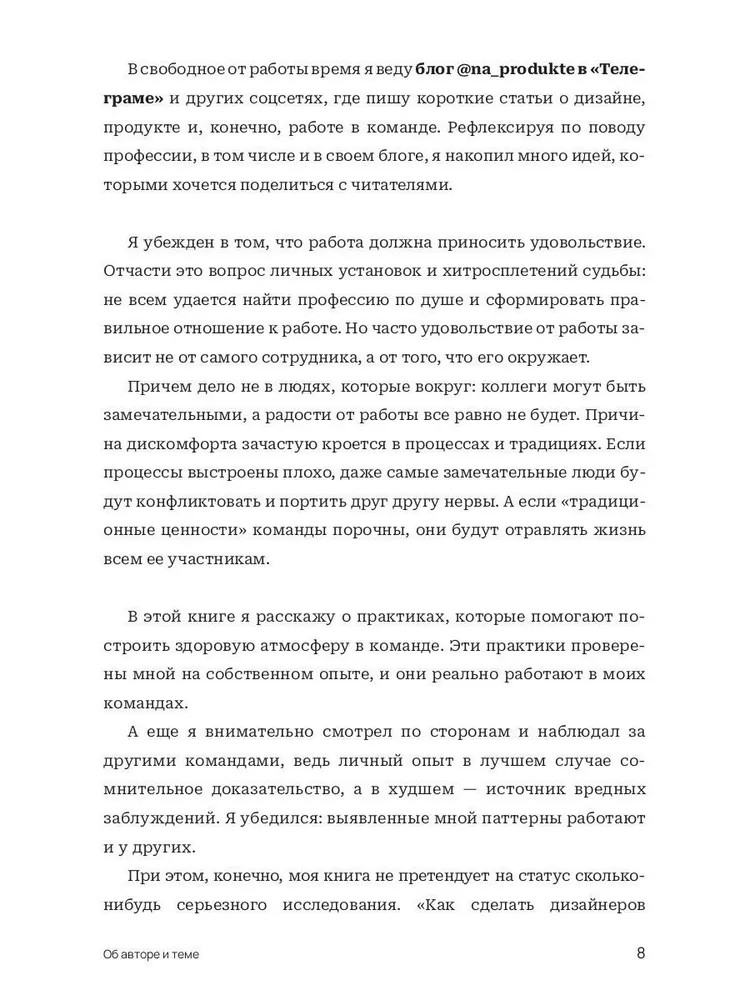 В книге «Как сделать дизайнеров счастливыми» Андрей Богданов на примере дизайн-команд в IT-индустрии показывает, как успешно закрыть эти потребности сотрудников. Применяя алгоритмы, описанные в книге, лидеры, менеджеры и сами дизайнеры смогут создать такие условия на работе, при которых захочется трудиться с интересом и не испытывать лишнего стресса.