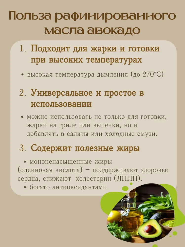Растительное масло, выжатое из плодов авокадо. Отличный источник антиоксидантов, незаменимых жирных кислот, минералов и витаминов. Отлично подходит для приготовления вкусных и полезных блюд. Травянистый и ореховый вкус хорошо подходит для использования, например, в качестве заправки для салатов или в качестве завершающего штриха. Универсальное и простое в использовании, масло авокадо имеет много преимуществ. Оно не только отлично подходит для приготовления пищи, гриля и выпечки, вы также можете добавлять его в холодном виде в салаты или смузи. Более того, это также безопасное и полезное кулинарное масло, поскольку его жирные кислоты остаются стабильными при высокой температуре (примерно до 520°F или 271°C).