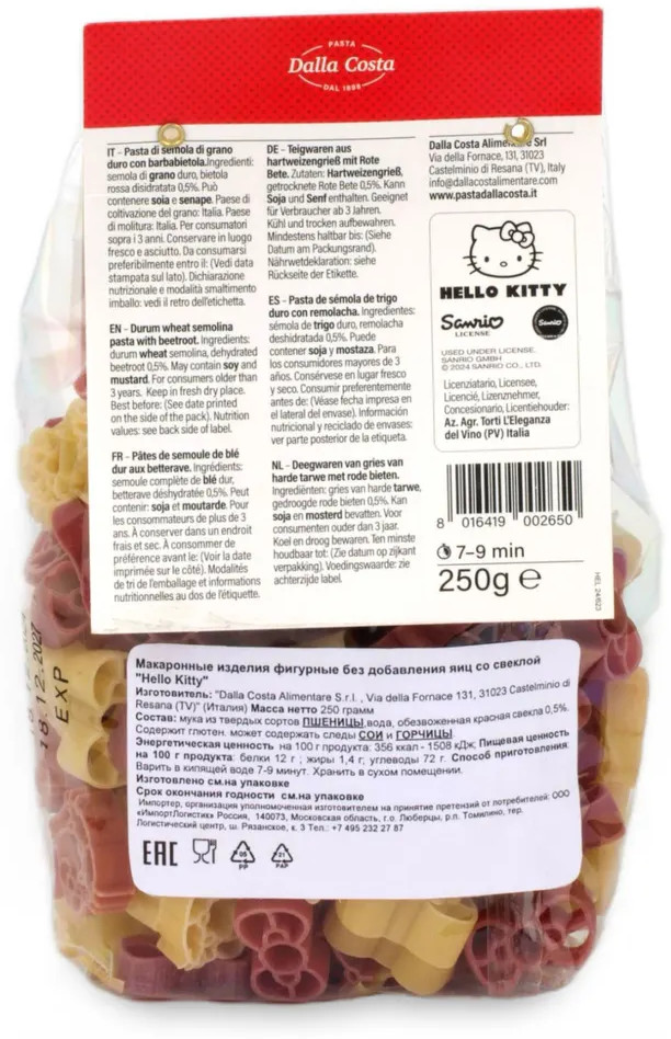 Dalla Costa Макароны для детей без яиц со свеклой «Hello Kitty»