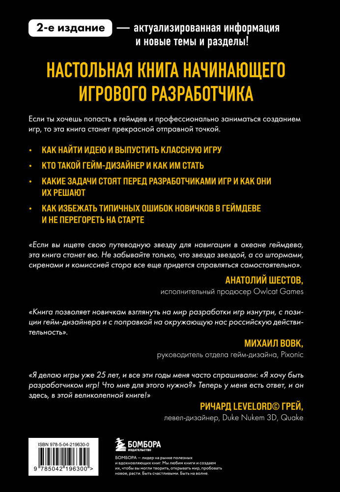 💳 Оплатить за товар можно при получении 🇰🇿 Есть бесплатная доставка по Казахстану от 1 дня 🎁 Копите бонусы с каждой покупки Серия: Российский компьютерный бестселлер. Гейм-дизайн Второе издание — актуализированная информация и новые темы и разделы! Настольная книга начинающего игрового разработчика. Если ты хочешь попасть в геймдев и профессионально заниматься созданием игр, то эта книга станет прекрасной отправной точкой: |