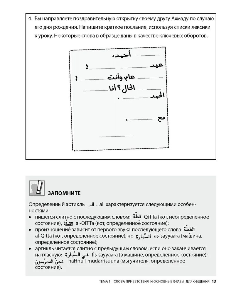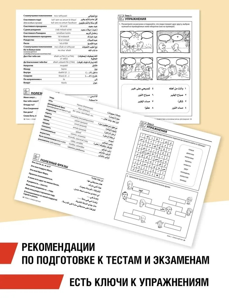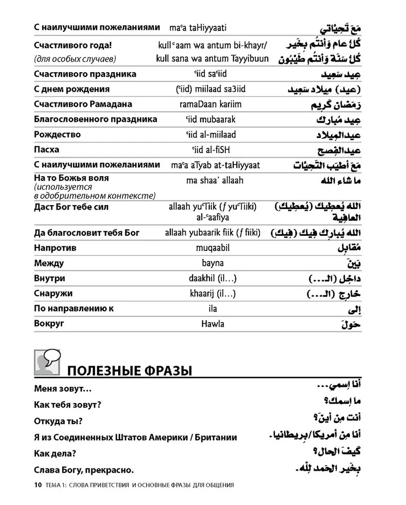 Арабский разговорный языкВ данный момент этот товар отсутствует в продаже. Возможно, у нас найдется аналогичный или похожий товар здесь. Если вы хотите быстро овладеть разговорным арабским языком и общаться без словаря — эта книга для вас. Пособие познакомит вас с важнейшей современной лексикой, которая нужна для повседневной жизни, чтения и прослушивания новостей, для дружеского общения во всем арабском мире. Главной особенностью данного пособия является то, что оно ориентировано на развитие речи и применение знаний на практике. 16 тем посвящены таким главным сферам жизни как семья, друзья, образование, работа, хобби, быт, мода, здоровье, чувства, СМИ, погода и т. п. Каждая тема содержит самую актуальную лексику и основную грамматику, которые увеличивают объем и разнообразие тем для обсуждения. Пособие можно использовать как для индивидуальной работы, так и для работы в группе, для самостоятельного изучения и занятий с преподавателем. В качестве дополнительных материалов в издание включены мнемокарточки и раздел «Подготовка к экзаменам», содержащий все необходимые тесты. В дополнение к книге выпущено аудиоприложение, чтобы легко научиться воспринимать арабскую речь на слух. |