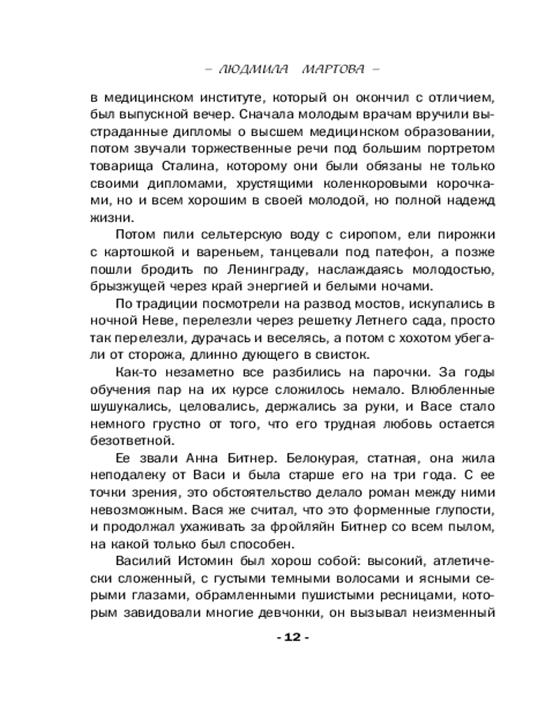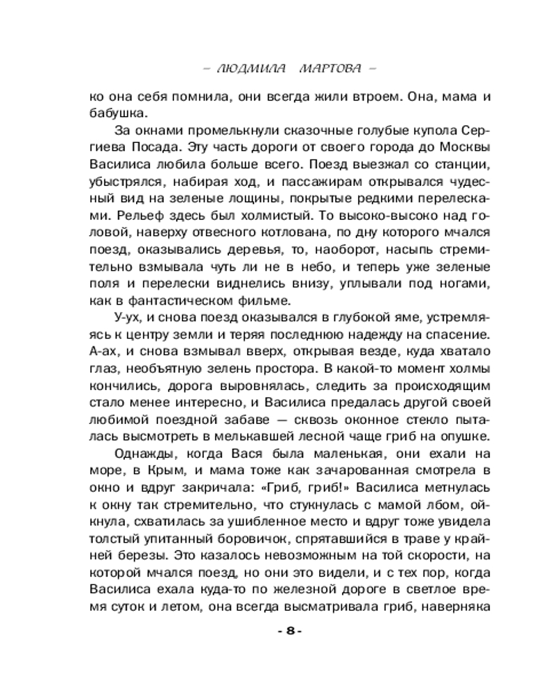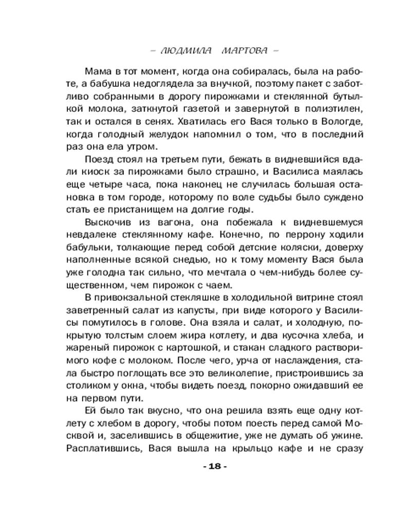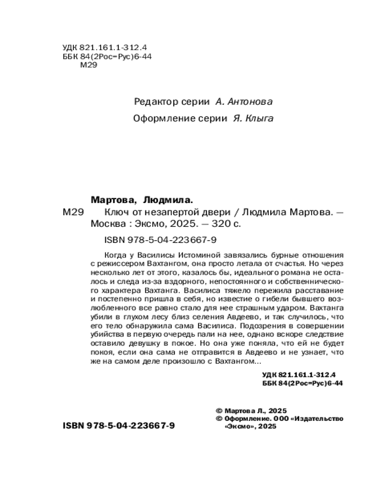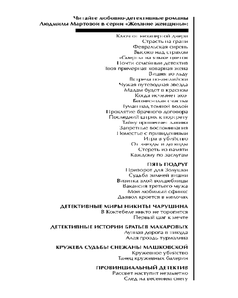 Серия: Желание женщины. Детективные романы Л. Мартовой. Новое оформление (обложка) Когда у Василисы Истоминой завязались бурные отношения с режиссером Вахтангом, она просто летала от счастья. Но через несколько лет от этого, казалось бы, идеального романа не осталось и следа из-за вздорного, непостоянного и собственнического характера Вахтанга. Василиса тяжело пережила расставание и постепенно пришла в себя, но известие о гибели бывшего возлюбленного все равно стало для нее страшным ударом. Вахтанга убили в глухом лесу близ селения Авдеево, и так случилось, что его тело обнаружила сама Василиса. Подозрения в совершении убийства в первую очередь пали на нее, однако вскоре следствие оставило девушку в покое. Но она уже поняла, что ей не будет покоя, если она сама не отправится в Авдеево и не узнает, что же на самом деле произошло с Вахтангом... |