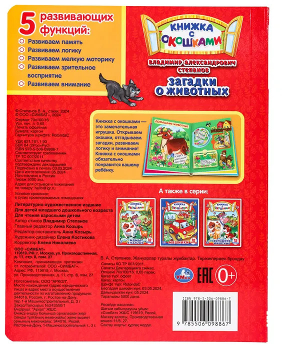 УМка Книжка с окошками «В. Степанов. Загадки о животных»Владимир Александрович Степанов В данный момент этот товар отсутствует в продаже. Возможно, у нас найдется аналогичный или похожий товар здесь. Книжка с окошками «В. Степанов. Загадки о животных» ТМ «УМка» станет прекрасным подарком для ребёнка. Малыш будет с удовольствием рассматривать яркие страницы и отгадывать интересные загадки про животных. Правильный ответ скрывается под секретным окошком. Книжка сделана из плотного картона, поэтому можно не опасаться, что ребёнок порвёт странички. Книжка с окошками ТМ «УМка» развивает: тактильные навыки, фантазию, образное мышление, внимание и память. |