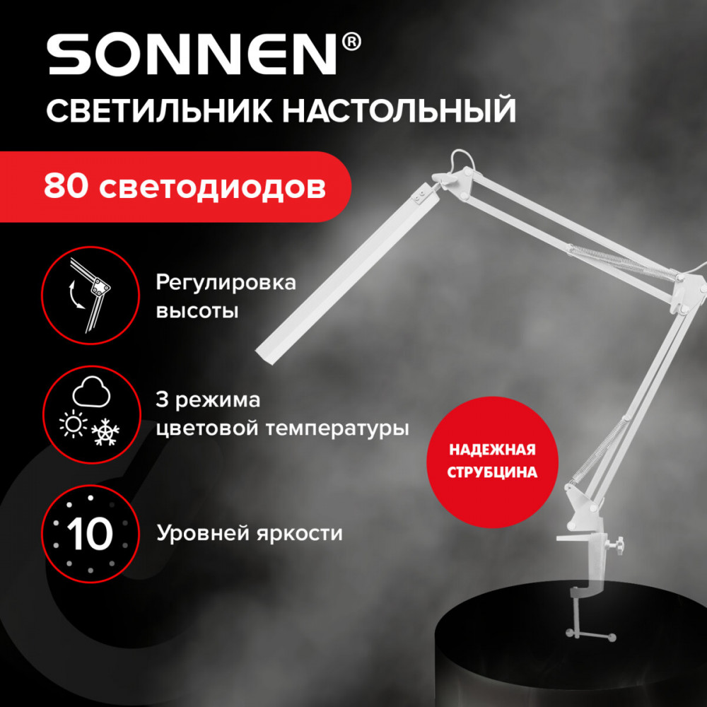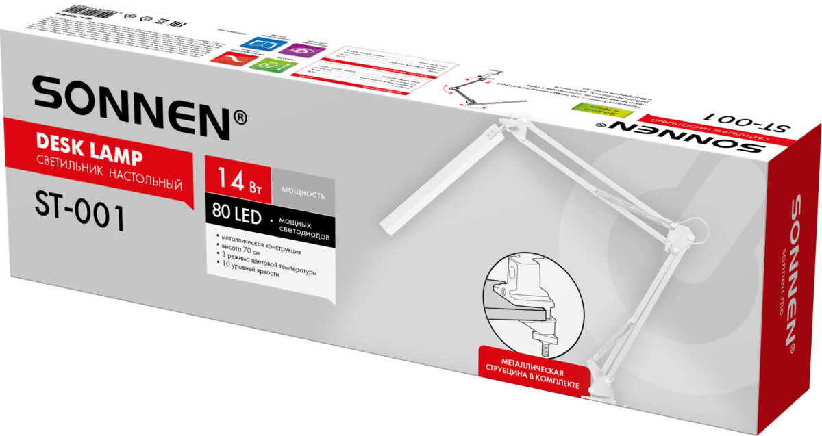 Настольная лампа-светильник Sonnen ST-001 предназначена для освещения рабочего места в офисе или дома. Конструкция светильника обеспечивает произвольную регулировку направления света. Cветодиодная лампа Sonnen ST-001 на струбцине сочетает в себе высокую мощность 14 Вт и продуманный функционал для комфортной работы в любых условиях. Благодаря 80 ярким диодам лампа обеспечивает равномерное, немерцающее освещение, которое не напрягает зрение даже при длительном использовании.