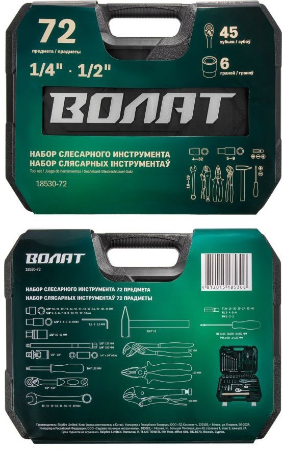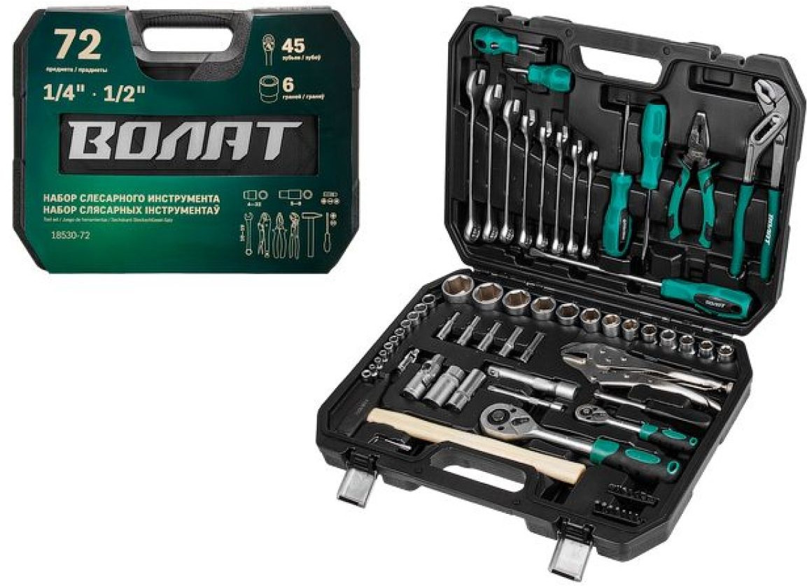 В данный момент этот товар отсутствует в продаже. Возможно, у нас найдется аналогичный или похожий товар здесь. Набор инструментов ВОЛАТ 18530-72 включает в себя типовые элементы — облегчает работу монтажника или ремонтника. Все компоненты выполнены из прочной стали. Имеется дополнительная защита от влаги. Можно использовать в гараже, мастерской, в бытовых условиях. Комплект охватывает основные сферы производства.