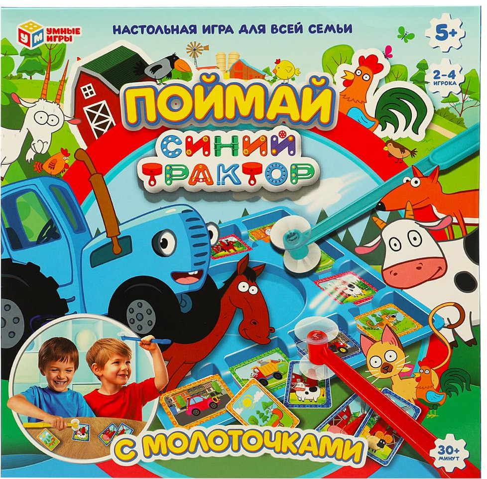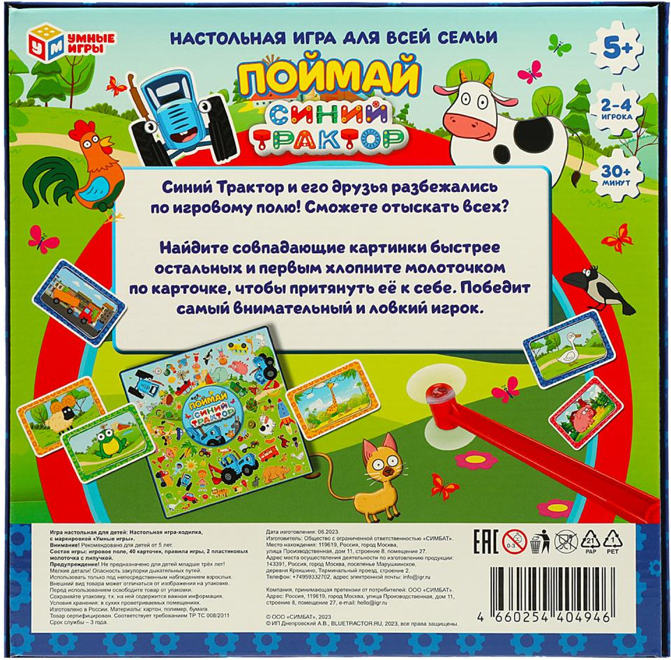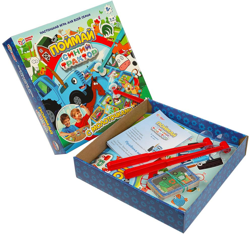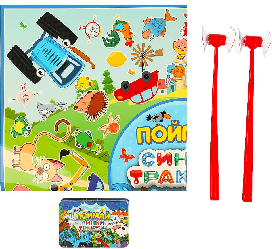 Синий Трактор и его друзья разбежались по игровому полю! Сможете отыскать всех? Во время хода найдите совпадающие картинки быстрее остальных и первым хлопните молоточком по карточке, чтобы притянуть её к себе. Игра заканчивается, когда изображения со всех карточек найдены. Победит самый внимательный и ловкий игрок. В состав игры входят 4 игрушечных молоточка.