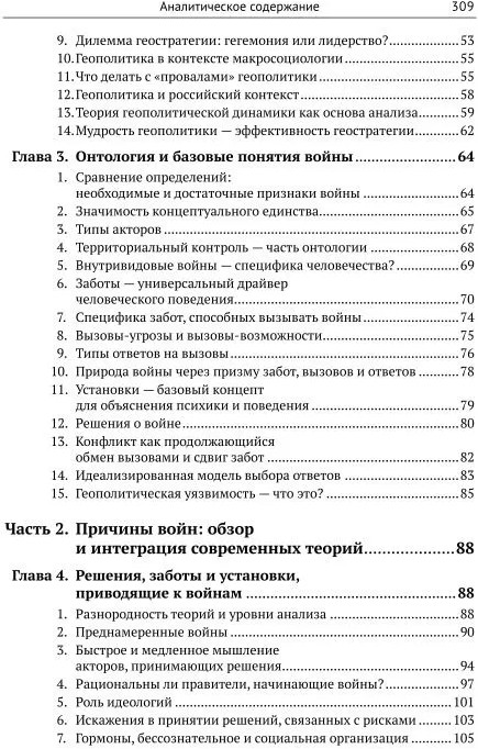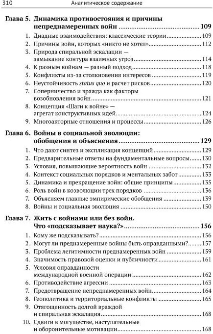 Представлено пестрое разнообразие современных западных концепций о причинах войн: от неореализма до когнитивных, теоретико-игровых подходов, концепций с упором на идеологии, национализм, бессознательное (Р. Джервис, Дж. Миршаймер, М. Манн, С. Ван Эвера, Дж. Орм, С. Лебланк, Дж. Лидер-Майнард, М. Мартин и др.). Особое внимание уделено динамике диадных отношений и спиральной эскалации агрессивных действий, явлениям долгой вражды, эмпирически подкрепленным агрегатным моделям, таким как «Шаги к войне» (К. Блаттман, Р. Лебоу, Дж. Леви, У. Томпсон, П. Сениз, Дж. Васкез).