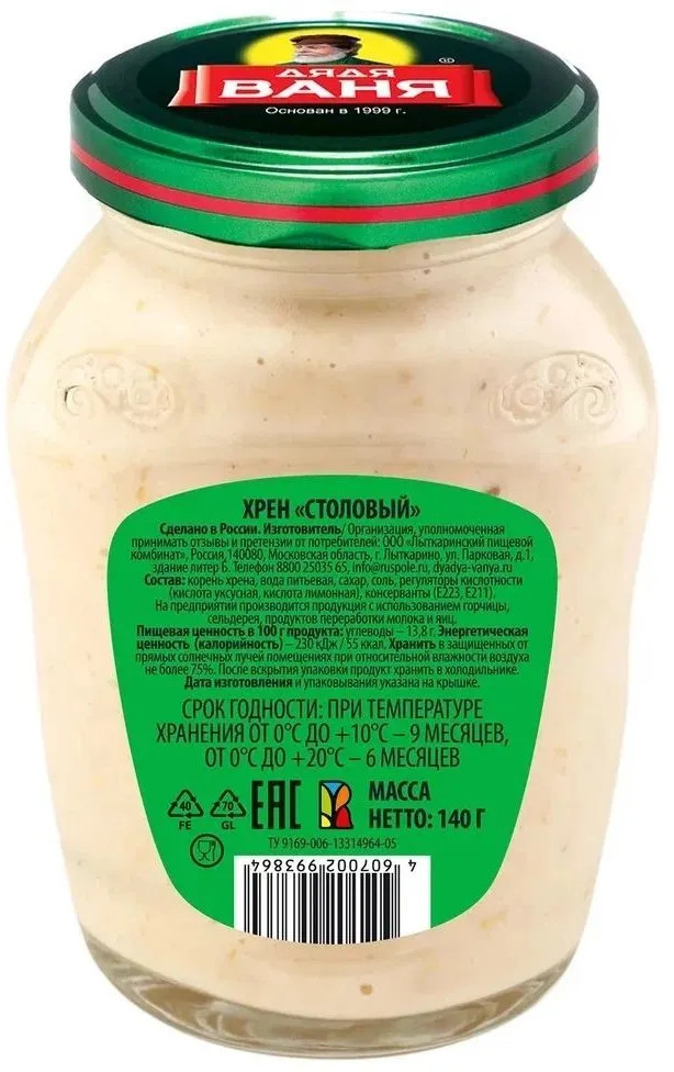 Дядя Ваня Хрен столовыйВ данный момент этот товар отсутствует в продаже. Возможно, у нас найдется аналогичный или похожий товар здесь. Хрен «Дядя Ваня» — любимый соус в зимнее время года на каждом столе. Свежий протертый хрен обладает пряным и терпким ароматом. Добавьте его в обычное блюдо, и оно приобретет пикантный вкус. Хрен идеально подходит к блюдам из рыбы и мяса, используется в качестве приправы к овощным блюдам и супам. |