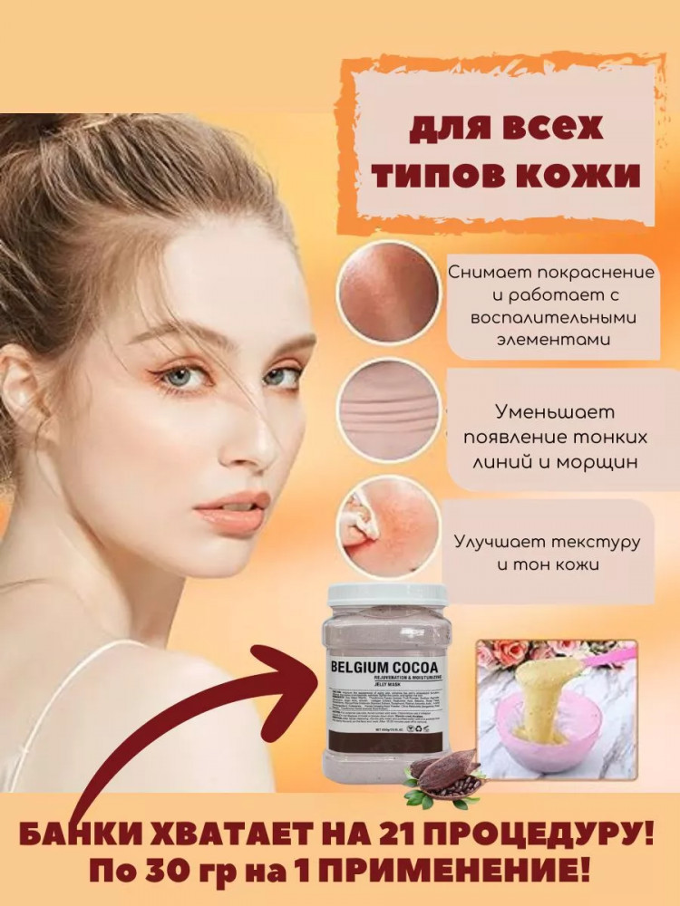 Откройте для своей кожи истинное спокойствие и свежесть с маской «Бельгийское какао» — профессиональной альгинатной гидрогелевой маской, обогащенной натуральным экстрактом семян Theobroma Cacao. Эта уникальная маска создана для глубокого ухода за кожей любого типа, особенно для сухой, чувствительной и возрастной, нуждающейся в восстановлении и омоложении.