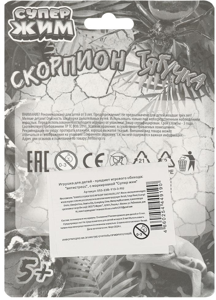 💳 Оплатить за товар можно при получении 🇰🇿 Есть бесплатная доставка по Казахстану от 1 дня 🎁 Копите бонусы с каждой покупки Игрушка-тянучка «Скорпион» ТМ «СуперЖим» непременно заинтересует маленьких любознаек. Эта занимательная тянучка в виде скорпиона обязательно понравится вашему ребёнку, он с удовольствием будет растягивать её в руках, наблюдая за тем, как она меняет и восстанавливает свою форму. К тому же тянущаяся игрушка является прекрасным тренажёром для детских пальчиков, развивающим мелкую моторику. Игра с тянучкой ТМ «Играем вместе» развивает: мелкую моторику, сенсорику, воображение и фантазию. |