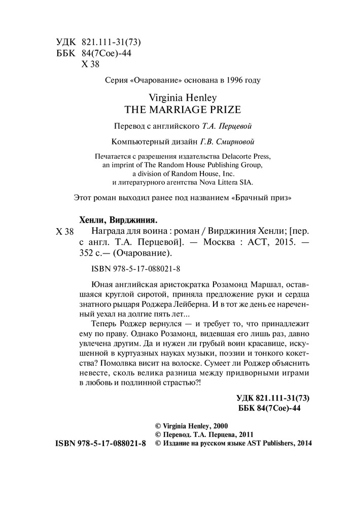 Награда для воинаВ данный момент этот товар отсутствует в продаже. Возможно, у нас найдется аналогичный или похожий товар здесь. Серия: Очарование Юная английская аристократка Розамонд Маршал, оставшаяся круглой сиротой, приняла предложение руки и сердца знатного рыцаря Роджера Лейберна. И в тот же день ее нареченный уехал на долгие пять лет… Теперь Роджер вернулся — и требует то, что принадлежит ему по праву. Однако Розамонд, видевшая его лишь раз, давно увлечена другим. Да и нужен ли грубый воин красавице, искушенной в куртуазных науках музыки, поэзии и тонкого кокетства? Помолвка висит на волоске. Сумеет ли Роджер объяснить невесте, сколь велика разница между придворными играми в любовь и подлинной страстью?! |