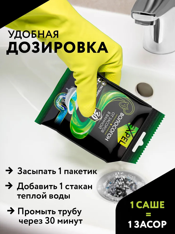 💳 Оплатить за товар можно при получении 🇰🇿 Есть бесплатная доставка по Казахстану от 1 дня 🎁 Копите бонусы с каждой покупки Устали бороться с засорами в ванной? Доверьтесь эксперту, который в два счёта справится с этой задачей Основная причина засоров в ванной — волосы. Специальное средство от засоров труб Expel Волосогон содержит особый кристаллический компонент, полностью разрушающий структуру волос. Вам нужно лишь высыпать содержимое саше в сливное отверстие и залить его стаканом воды, чтобы активировать действующее вещество и запустить химическую реакцию. Остальное Expel Волосогон сделает за вас всего за 30 минут. С EXPEL засоры просто улетучиваются! |