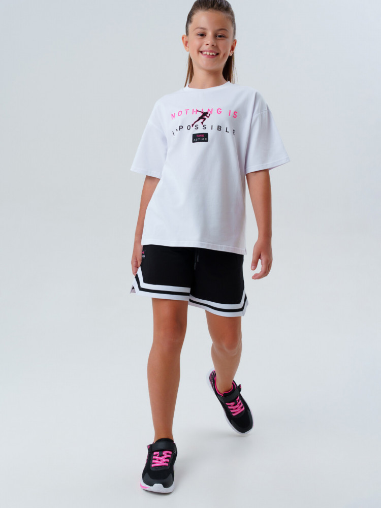 Классический спортивный костюм для девочки подростка от PlayToday — находка для школы, физкультуры и ярких прогулок! Этот универсальный комплект включает базовую белую футболку оверсайз с трендовым рисунком и комфортные шорты на мягкой резинке со шнурком. Такой спортивный костюм для девочки-школьницы продуман до мелочей и идеально подойдёт для уроков физкультуры, секций, активного отдыха и прогулок во дворе.