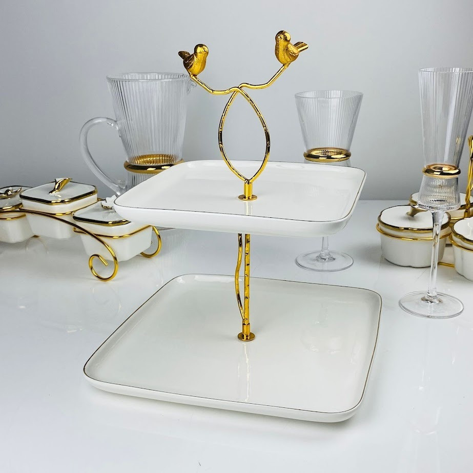💳 Оплатить за товар можно при получении 🇰🇿 Есть бесплатная доставка по Казахстану от 1 дня 🎁 Копите бонусы с каждой покупки Серия: Melody Элегантная двухъярусная этажерка — идеальный элемент для стильной сервировки десертов, фруктов или закусок. Выполнена из высококачественного фарфора с гладким белоснежным покрытием и изящной золотой окантовкой по краю тарелок. Центр композиции — декоративная ручка в форме птичек с позолотой, придающая изделию изысканный и роскошный вид. |