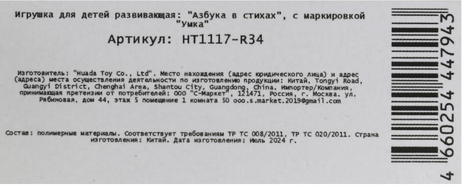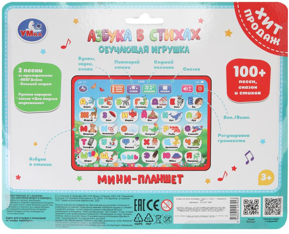 💳 Оплатить за товар можно при получении 🇰🇿 Есть бесплатная доставка по Казахстану от 1 дня 🎁 Копите бонусы с каждой покупки Мини-планшет «Азбука в стихах» ТМ «УМка» станет прекрасным подарком для маленьких любознаек. Игрушка-планшет — креативный и полезный подарок для развития и игры. Такой планшет поможет ребёнку быстро и эффективно выучить алфавит. Малыш с удовольствием будет нажимать на кнопки и слушать песни, стихи и интересную сказку. Мини-планшет ТМ «УМка» способствует расширению кругозора и развивает: звуковое восприятие и музыкальный слух, память, мелкую моторику, фантазию и речь. |