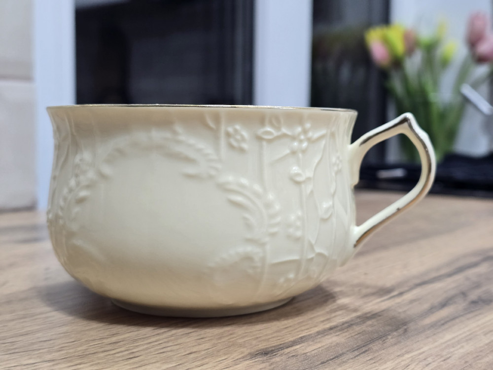 Очень красивая кружечка. Аккуратная, стильная, пришла в красивой коробочке. Были опасения, что позолота слезет после мытья в посудомойке- не оправдались, всё золото на месте. Спасибо Флипу.