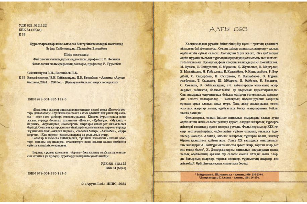 💳 Оплатить за товар можно при получении 🇰🇿 Есть бесплатная доставка по Казахстану от 1 дня 🎁 Копите бонусы с каждой покупки «Қазақстан балалар энциклопедиясының» келесі томы «Ежелгі эпостар» деп аталады. Бұл жинаққа қазақ халық әдебиетінің үлкен бір саласы — көне эпос үлгілері топтастырылған. Кітапта бұрын-соңды жеке жинақ түрінде басылып шықпаған «Дотан», «Құбығұл», «Мұңлық — Зарлық», «Құламерген, Жоямерген» жырлары алғаш рет жинақталып берілді. Сонымен қатар, қысқа үзінділері сақталған және қара сөз түрінде жұрнағы қалған «Аққоян мерген», «Төлеген батыр», «Ақ Көбек», «Қара мерген», «Хан мерген» сияқты жырлар да ұсынылып отыр. Балалар танымына лайықталып, түсінікті жазылған «Ежелгі эпостар» жинағы оқушыларға, студенттерге және жалпы халық әдебиетін сүйетін көп шілікке арналған. Барлық құқығы қорғалған. «Аруна» баспасының жазбаша рұқсатынсыз кітаптан үзінділерді, суреттерді көшіріп басуға болмайды. |
