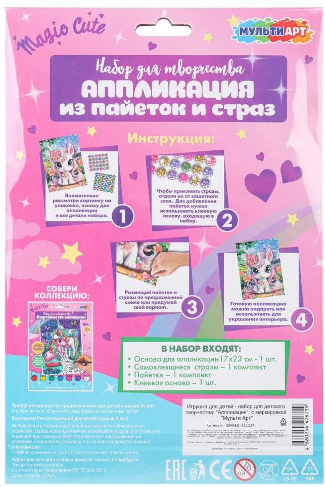 💳 Оплатить за товар можно при получении 🇰🇿 Есть бесплатная доставка по Казахстану от 1 дня 🎁 Копите бонусы с каждой покупки Серия: Сказочная мастерская Аппликация из пайеток и страз «Единорог» — это отличный подарок для вашего ребёнка, который будет способствовать развитию его творческих способностей. С помощью этого набора юный художник сможет самостоятельно создать сверкающую аппликацию с изображением очаровательного единорога. Готовую поделку можно подарить близким или использовать для украшения интерьера. |