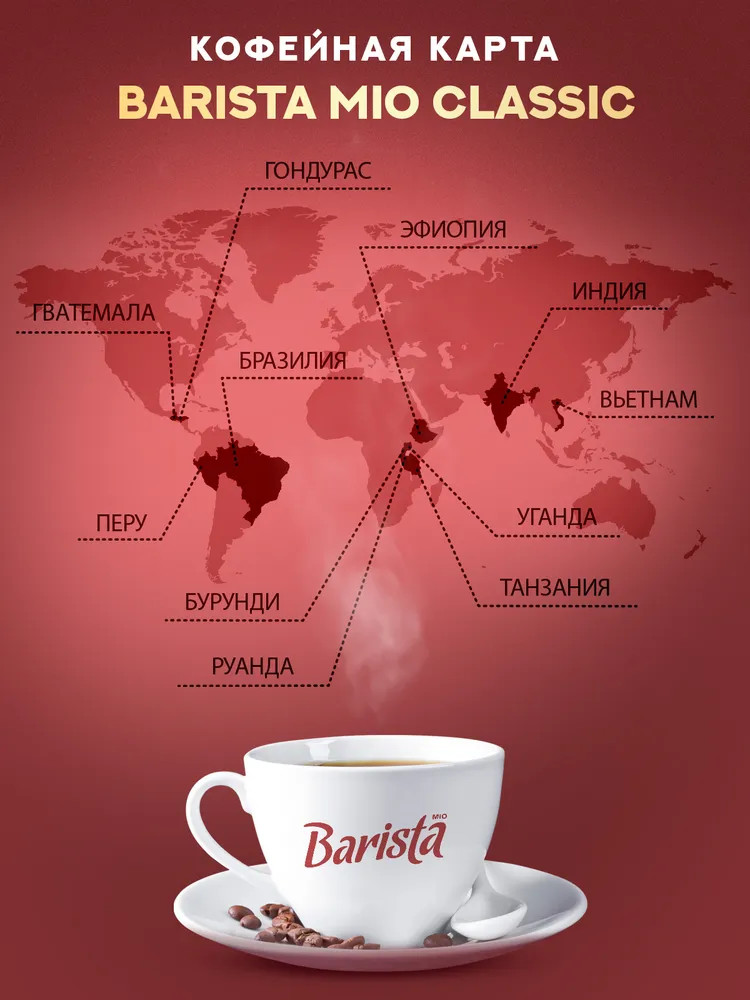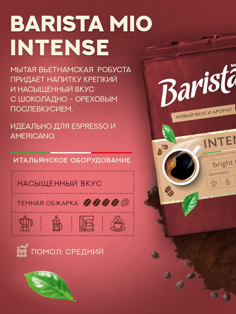 Молотый кофе Barista MIO Intense в вакуумной упаковке — это интенсивный кофе среднего помола, созданный для настоящих ценителей яркого вкуса и удобства в каждом глотке. В основе бленда — мытая вьетнамская робуста, известная своей плотной текстурой и мощным характером. Приготовленный напиток раскрывается выразительным, насыщенным вкусом с глубокой горчинкой, переходящей в благородное шоколадно-ореховое послевкусие, которое долго остается на языке.