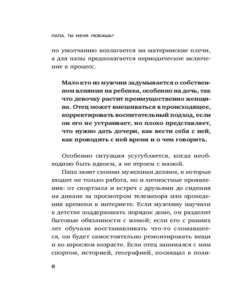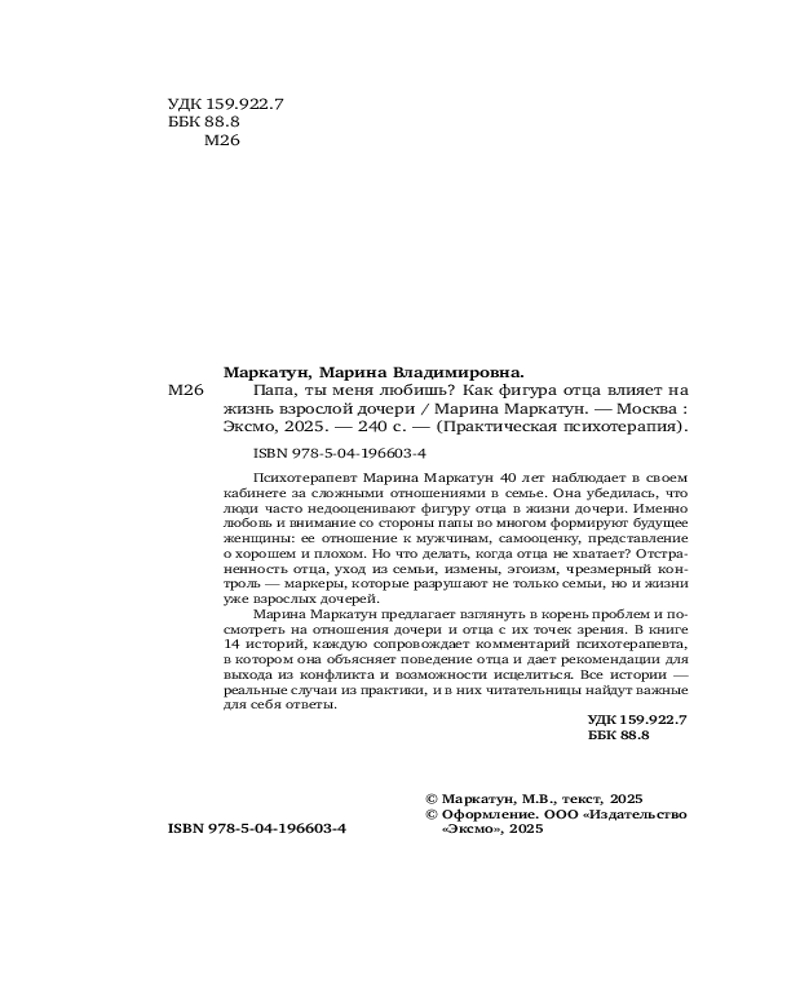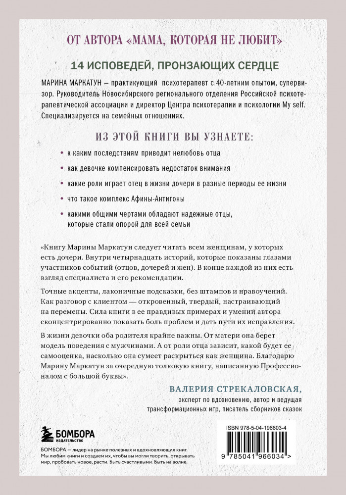 💳 Оплатить за товар можно при получении 🇰🇿 Есть бесплатная доставка по Казахстану от 1 дня 🎁 Копите бонусы с каждой покупки Серия: Практическая психотерапия Психотерапевт Марина Маркатун 40 лет наблюдает в своем кабинете за сложными отношениями в семье. Она убедилась, что люди часто недооценивают фигуру отца в жизни дочери. Именно любовь и внимание со стороны папы во многом формируют будущее женщины: ее отношение к мужчинам, самооценку, представление о хорошем и плохом. Но что делать, когда отца не хватает? Отстраненность отца, уход из семьи, измены, эгоизм, чрезмерный контроль – маркеры, которые разрушают не только семьи, но и жизни уже взрослых дочерей. |