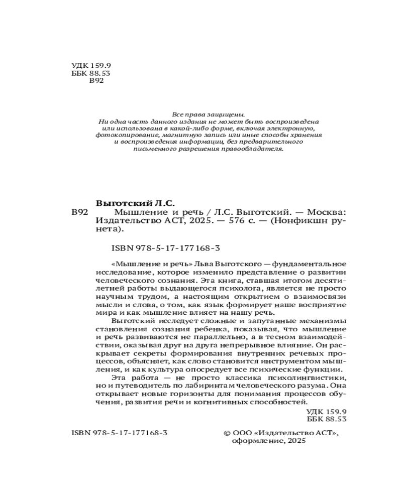 💳 Оплатить за товар можно при получении 🇰🇿 Есть бесплатная доставка по Казахстану от 1 дня 🎁 Копите бонусы с каждой покупки Серия: Нонфикшн Рунета «Мышление и речь» Льва Выготского — фундаментальное исследование, которое изменило представление о развитии человеческого сознания. Эта книга, ставшая итогом десятилетней работы выдающегося психолога, является не просто научным трудом, а настоящим открытием о взаимосвязи мысли и слова, о том, как язык формирует наше восприятие мира и как мышление влияет на нашу речь. |