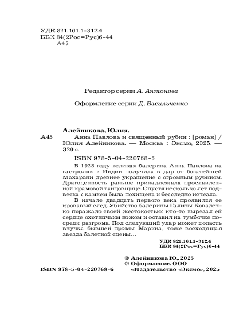 💳 Оплатить за товар можно при получении 🇰🇿 Есть бесплатная доставка по Казахстану от 1 дня 🎁 Копите бонусы с каждой покупки Серия: Преступные камни. Лучшие детективы о драгоценностях. Новое оформление (обложка) В 1928 году великая балерина Анна Павлова на гастролях в Индии получила в дар от богатейшей Махарани древнее украшение с огромным рубином. Драгоценность раньше принадлежала прославленной храмовой танцовщице. Спустя несколько лет подвеска с камнем была похищена и бесследно исчезла. В начале двадцать первого века проявился ее кровавый след. Убийство балерины Галины Коваленко поражало своей жестокостью: кто-то вырезал ей сердце охотничьим ножом и оставил на тумбочке посреди разгрома. Под следующий удар может попасть внучка бывшей примы Марина, тоже восходящая звезда балетной сцены... Тайну рубина вы узнаете, прочитав детектив Юлии Алейниковой. |