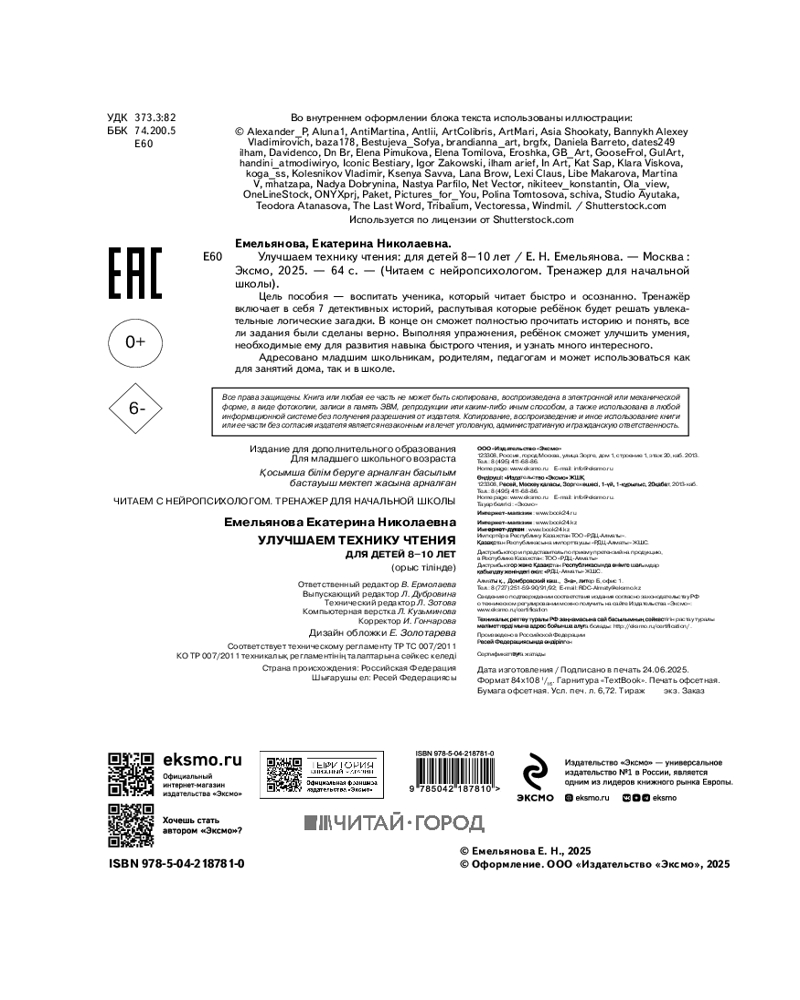 💳 Оплатить за товар можно при получении 🇰🇿 Есть бесплатная доставка по Казахстану от 1 дня 🎁 Копите бонусы с каждой покупки Серия: Читаем с нейропсихологом. Тренажер для начальной школы Развивающее пособие от издательства «Эксмо» поможет школьнику улучшить технику чтения, развить логическое мышление, повысить уровень внимания, расширить словарный запас. В основе книги лежит нейропсихологический подход, способствующий быстрому и эффективному обучению чтению, ведь чтение требует сосредоточенности и активной работы двух полушарий мозга. Книга-тренажёр составлена таким образом, чтобы, читая, ребёнок распутывал несложные логические задачки, находил ответы и был заинтересован в результате. |