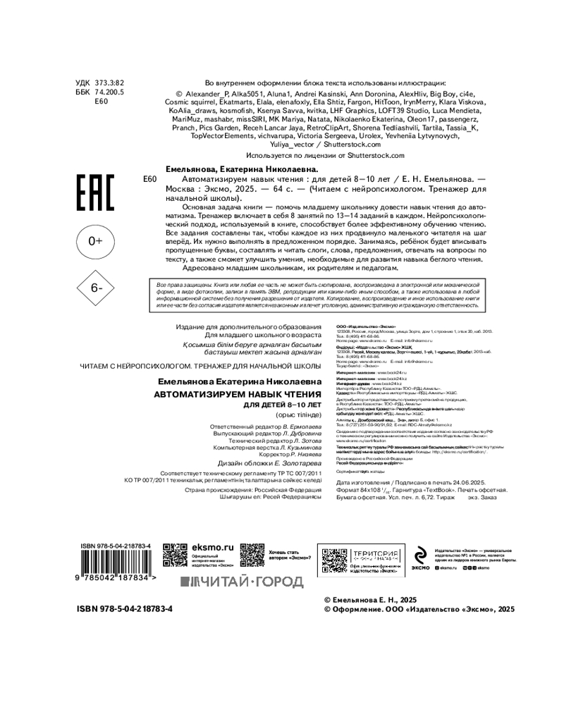 💳 Оплатить за товар можно при получении 🇰🇿 Есть бесплатная доставка по Казахстану от 1 дня 🎁 Копите бонусы с каждой покупки Серия: Читаем с нейропсихологом. Тренажер для начальной школы Книга-тренажёр от издательства «Эксмо» призвана помочь младшим школьникам автоматизировать навык осознанного чтения. В основе книги лежит нейропсихологический подход, способствующий эффективному обучению чтению, ведь чтение требует внимания и слаженной работы обоих полушарий мозга. Занимаясь, ребёнок будет образовывать слоги и читать их, вписывать пропущенные буквы, читать столбики слов то шёпотом, то громко, составлять предложения по картинкам, отвечать на вопросы по тексту. Все упражнения расположены таким образом, чтобы каждое задание продвинуло маленького читателя на шаг вперёд. |