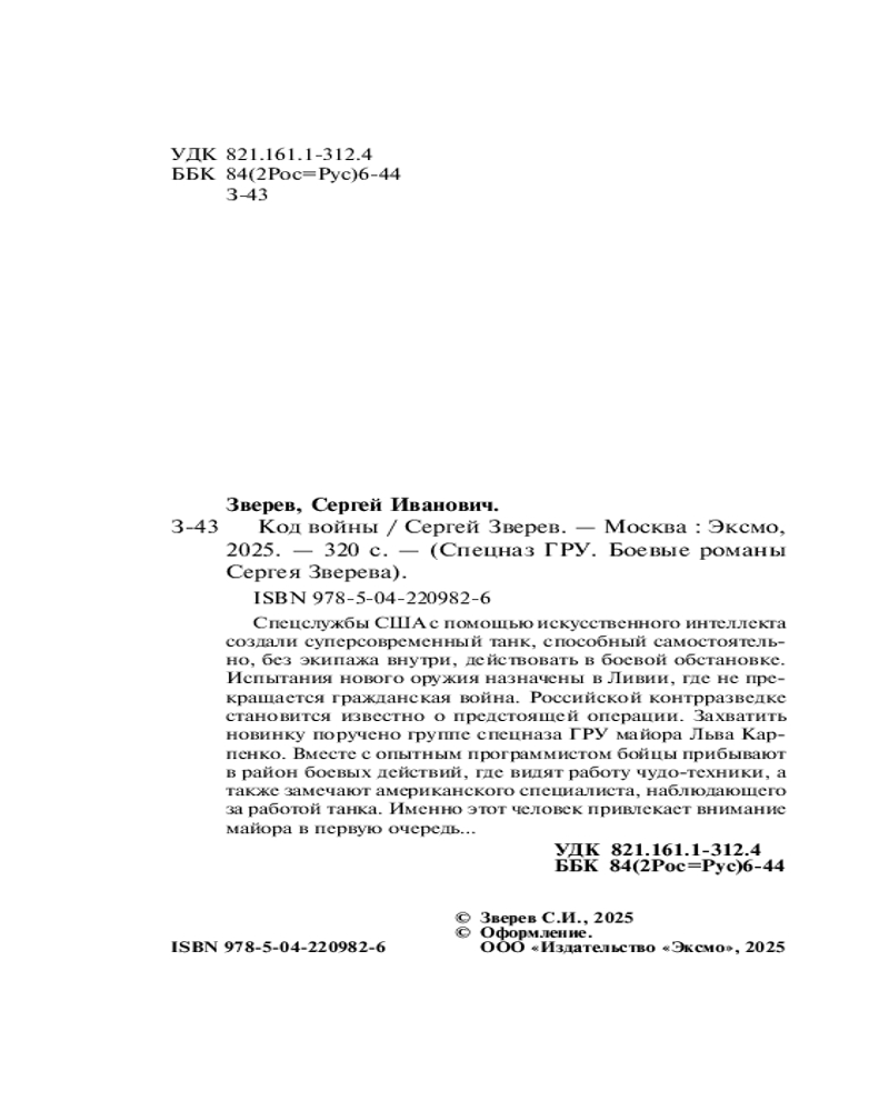 💳 Оплатить за товар можно при получении 🇰🇿 Есть бесплатная доставка по Казахстану от 1 дня 🎁 Копите бонусы с каждой покупки Серия: Спецназ ГРУ. Боевые романы Сергея Зверева Спецслужбы США с помощью искусственного интеллекта создали суперсовременный танк, способный самостоятельно, без экипажа внутри, действовать в боевой обстановке. Испытания нового оружия назначены в Ливии, где не прекращается гражданская война. Российской контрразведке становится известно о предстоящей операции. Захватить новинку поручено группе спецназа ГРУ майора Льва Карпенко. Вместе с опытным программистом бойцы прибывают в район боевых действий, где видят работу чудо-техники, а также замечают американского специалиста, наблюдающего за работой танка. Именно этот человек привлекает внимание майора в первую очередь... |