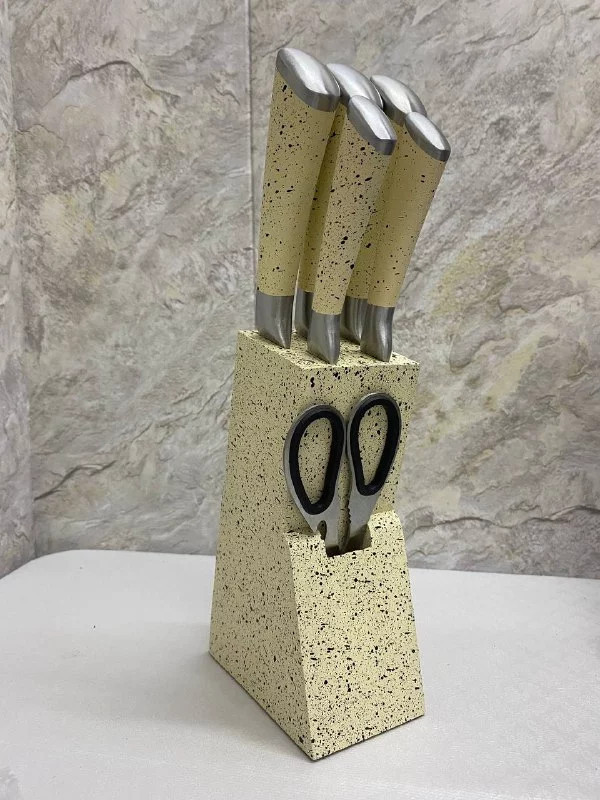 Набор кухонных ножей с подставкой и ножницами. Отличный универсальный набор для повседневного использования на кухне. Стильно смотрится, надёжен в работе, подойдёт как для дома, так и в подарок. |