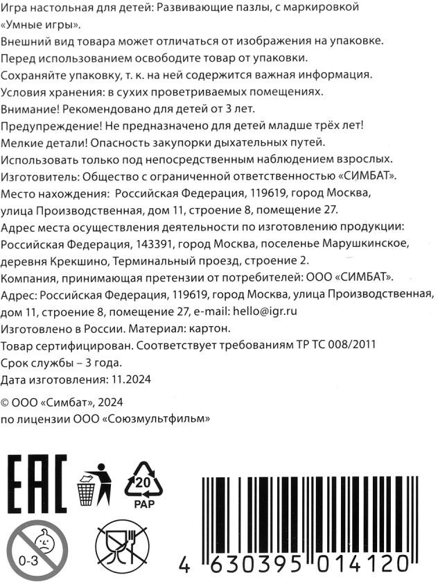💳 Оплатить за товар можно при получении 🇰🇿 Есть бесплатная доставка по Казахстану от 1 дня 🎁 Копите бонусы с каждой покупки Серия: Союзмультфильм Макси-пазлы «Союзмультфильм. Возвращение блудного попугая» ТМ «Умные игры» — интересная развивающая игра для самых маленьких. Задача ребёнка — подобрать детали из набора так, чтобы собрать картинки с изображением героев известного мультфильма — всего 5 вариантов. Благодаря небольшому количеству деталей, малыш без труда сможет выполнить задание, с каждым разом делая это всё лучше и быстрее. |